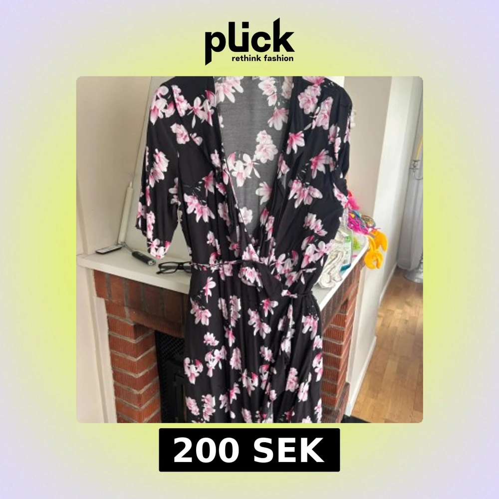 Säljer en svart omlottklänning med rosa och vita blommor. Klänningen har v-ringning, knytband i midjan och halvlånga ärmar. Perfekt för vår och sommar när du vill känna dig både bekväm och snygg.