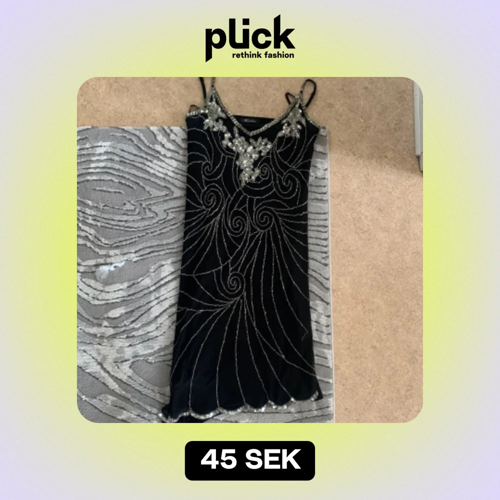 Säljer en elegant svart klänning från Envie. Den har tunna axelband och är dekorerad med glittriga detaljer i ett virvlande mönster. Perfekt för en festlig kväll!