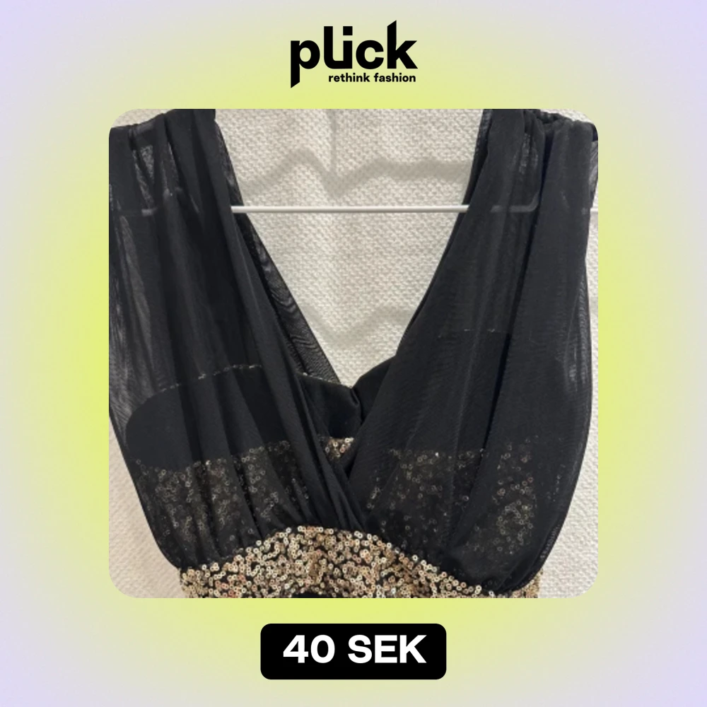Svart guldglittrande klänning. Elastiskt tyg, rynkad i sidan. Guld med paljetter.