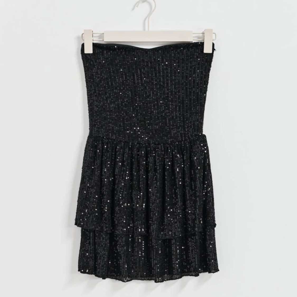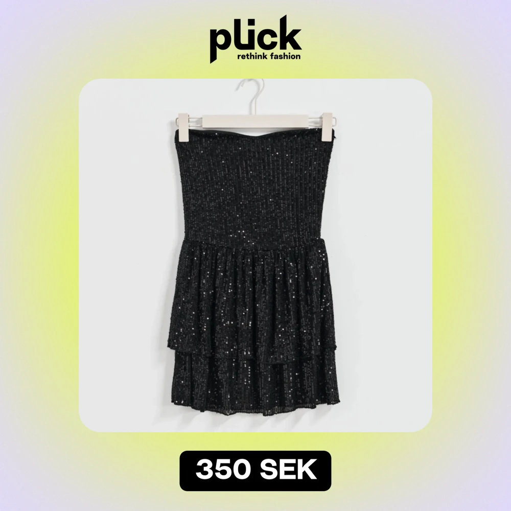 Snygg svart axelbandslös klĂ€nning frĂ„n Gina Tricot Young i storlek 170, jag Ă€r 175 och den passar mig. KlĂ€nningen Ă€r tĂ€ckt med glittriga paljetter och har en volangdetalj i kjolen. Original pris Ă€r 400, slutsĂ„ld pĂ„ hemsidan och jag har endast anvĂ€nt den EN gĂ„ng!âš