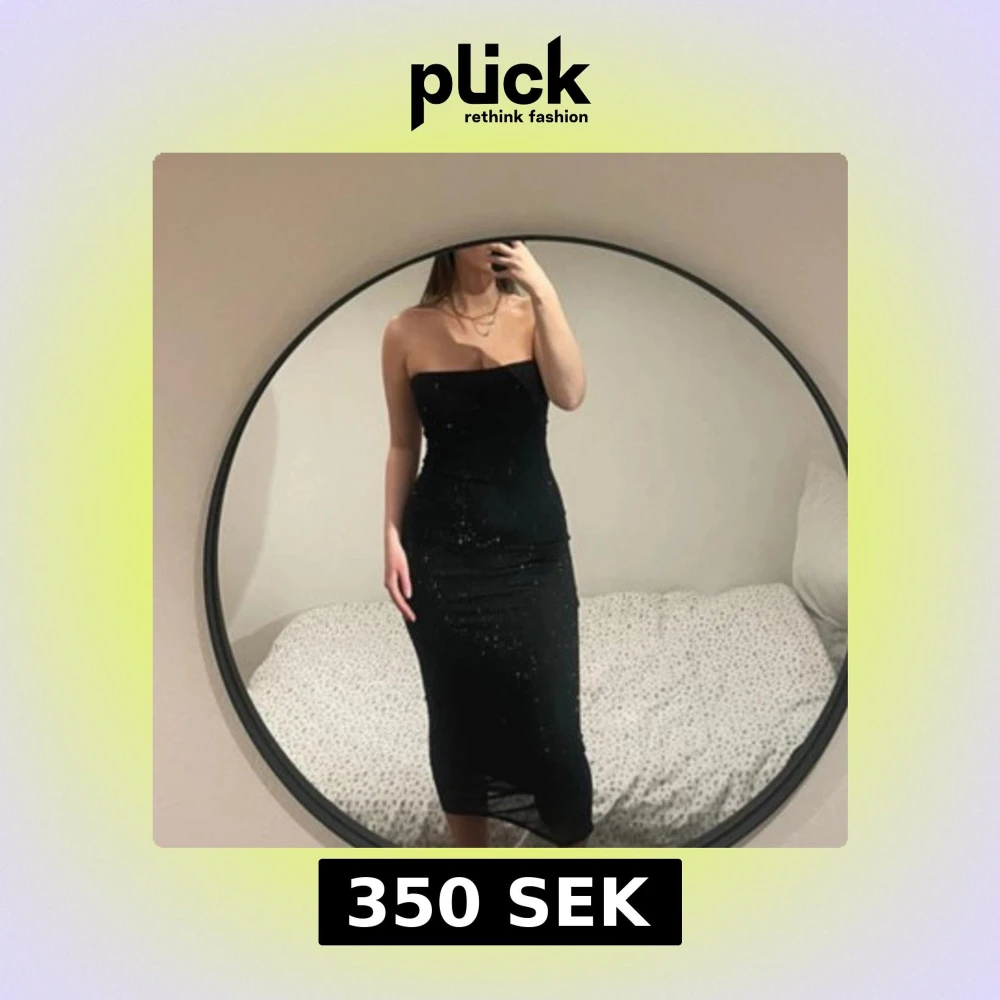 Säljer en svart axelbandslös klänning från Amisu med glittriga detaljer. Klänningen har en tight passform och är perfekt för festliga tillfällen. Materialet är mjukt och stretchigt för en bekväm känsla.
