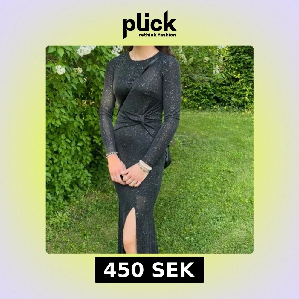 Säljer en svart långklänning från Bubbleroom med glittrigt tyg, lång ärm, en snygg slits framtill och en twistad detalj i midjan. Endast använd vid ett tillfälle!