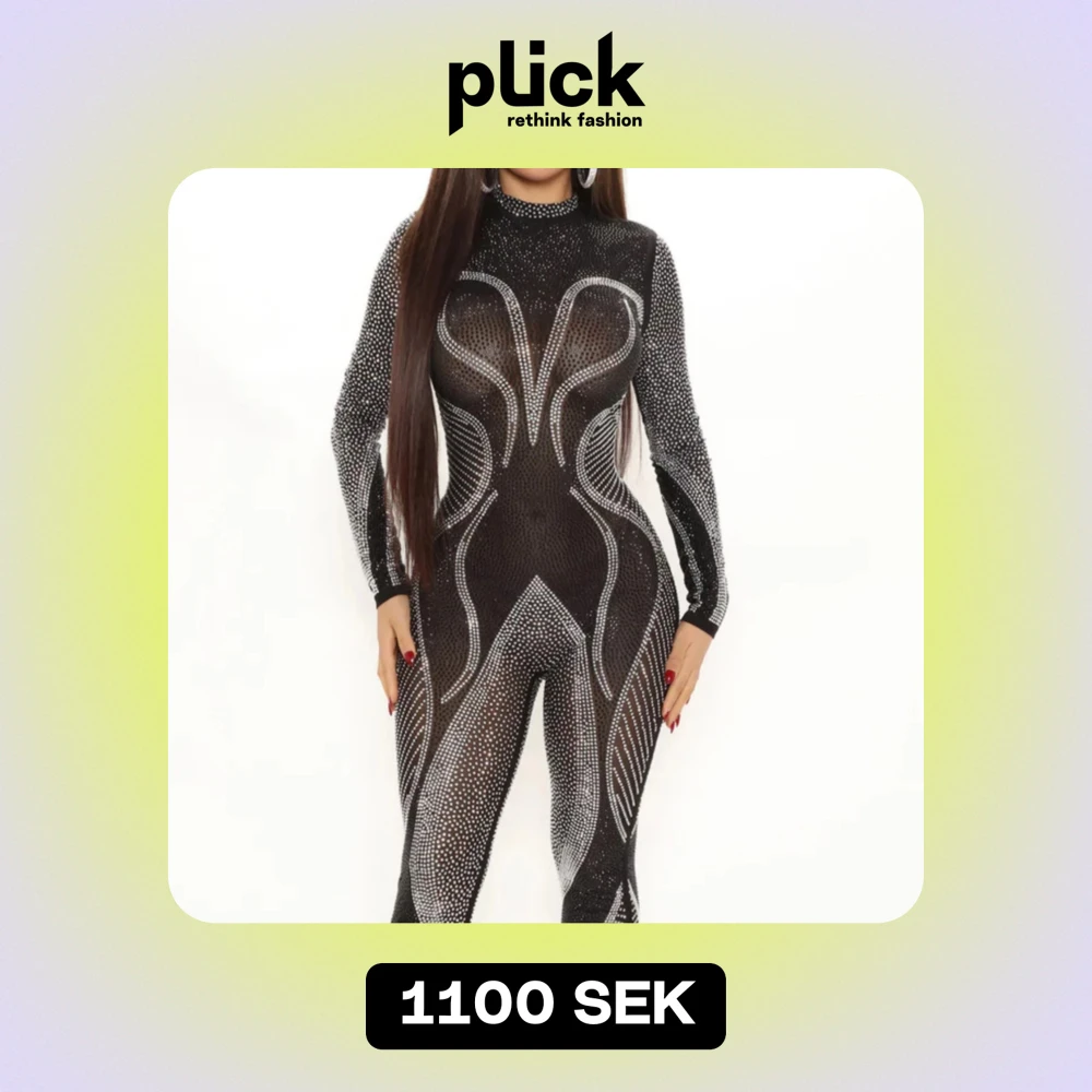 Snygg svart jumpsuit med glittriga detaljer som verkligen fångar ljuset. Den har en tight passform och långa ärmar, perfekt för en festkväll. Materialet är stretchigt och bekvämt, vilket gör den lätt att röra sig i. Den höga halsen ger en elegant touch.