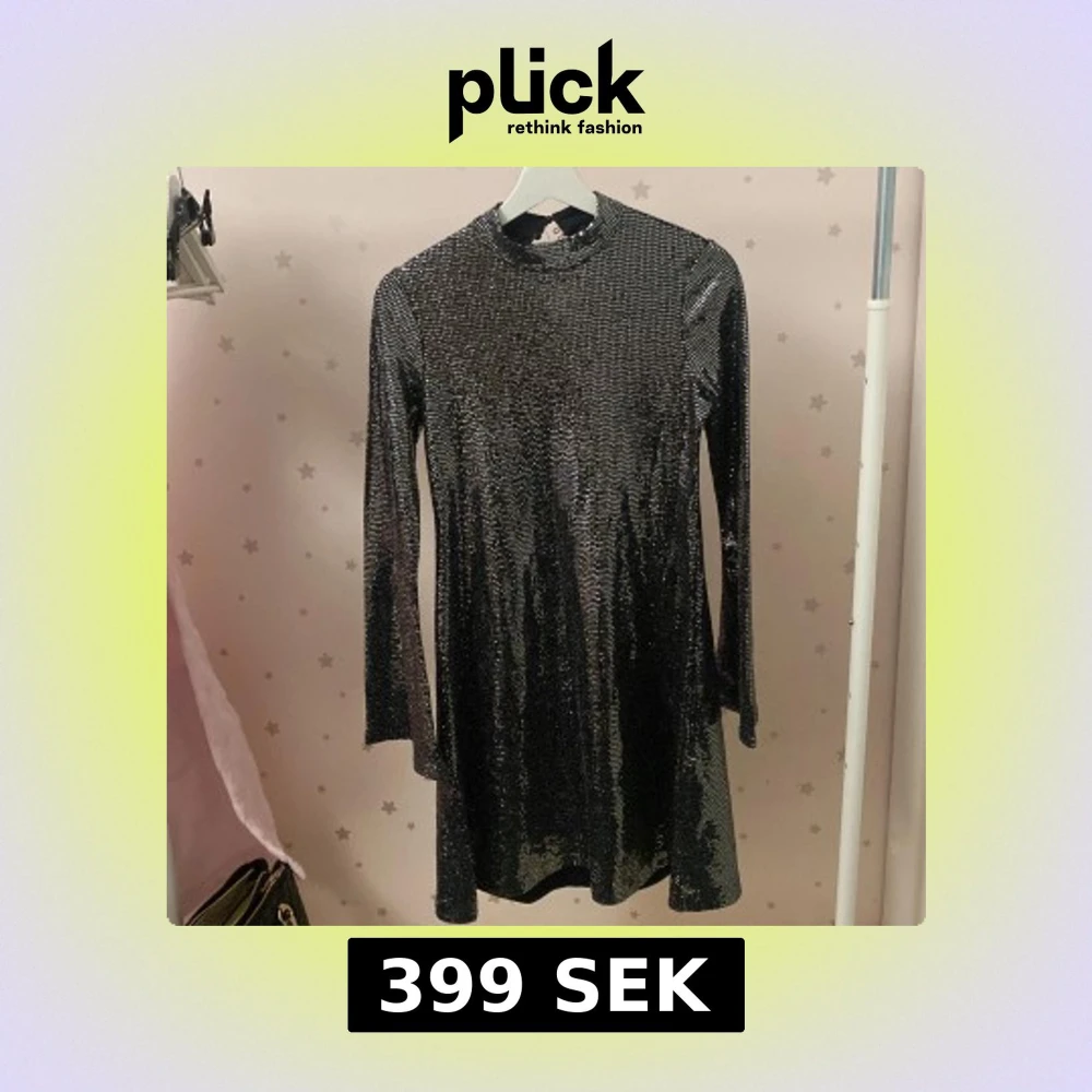Snygg svart glittrig klänning med långa ärmar och en liten öppning i ryggen. Perfekt för en kväll ute eller en festlig tillställning. Storlek XS/S