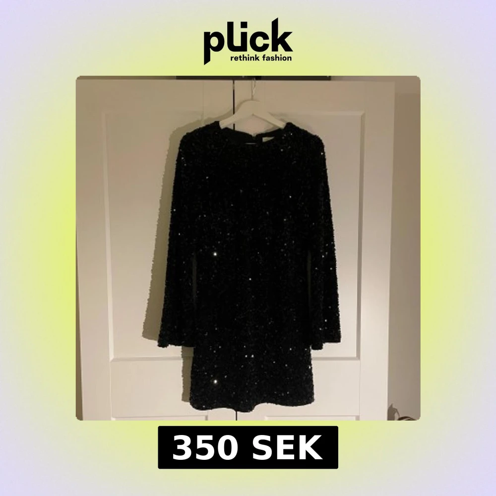 Snygg svart klänning med glittriga paljetter. Klänningen har långa vida ärmar och en kort längd, perfekt för en utekväll! Inga defekter och tappar inga paljetter. Använd 1 gång. 🖤✨