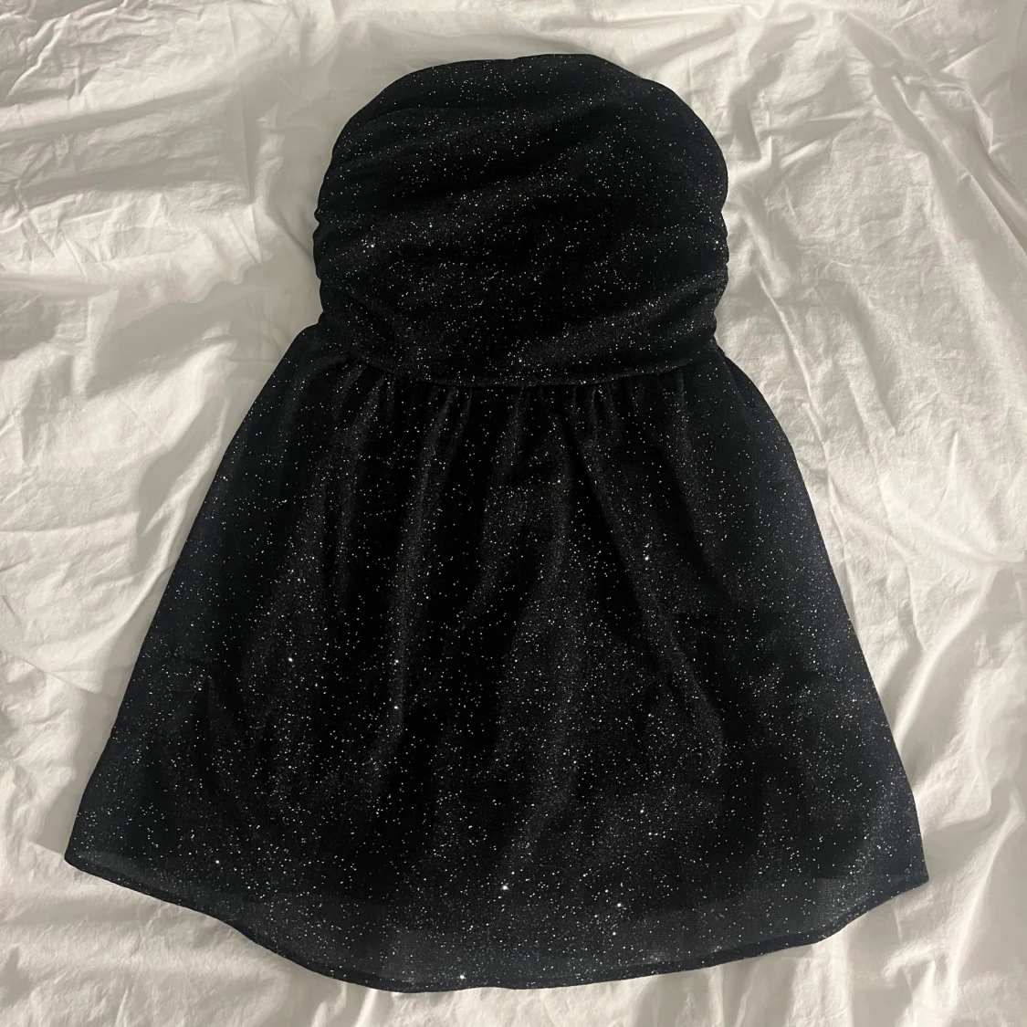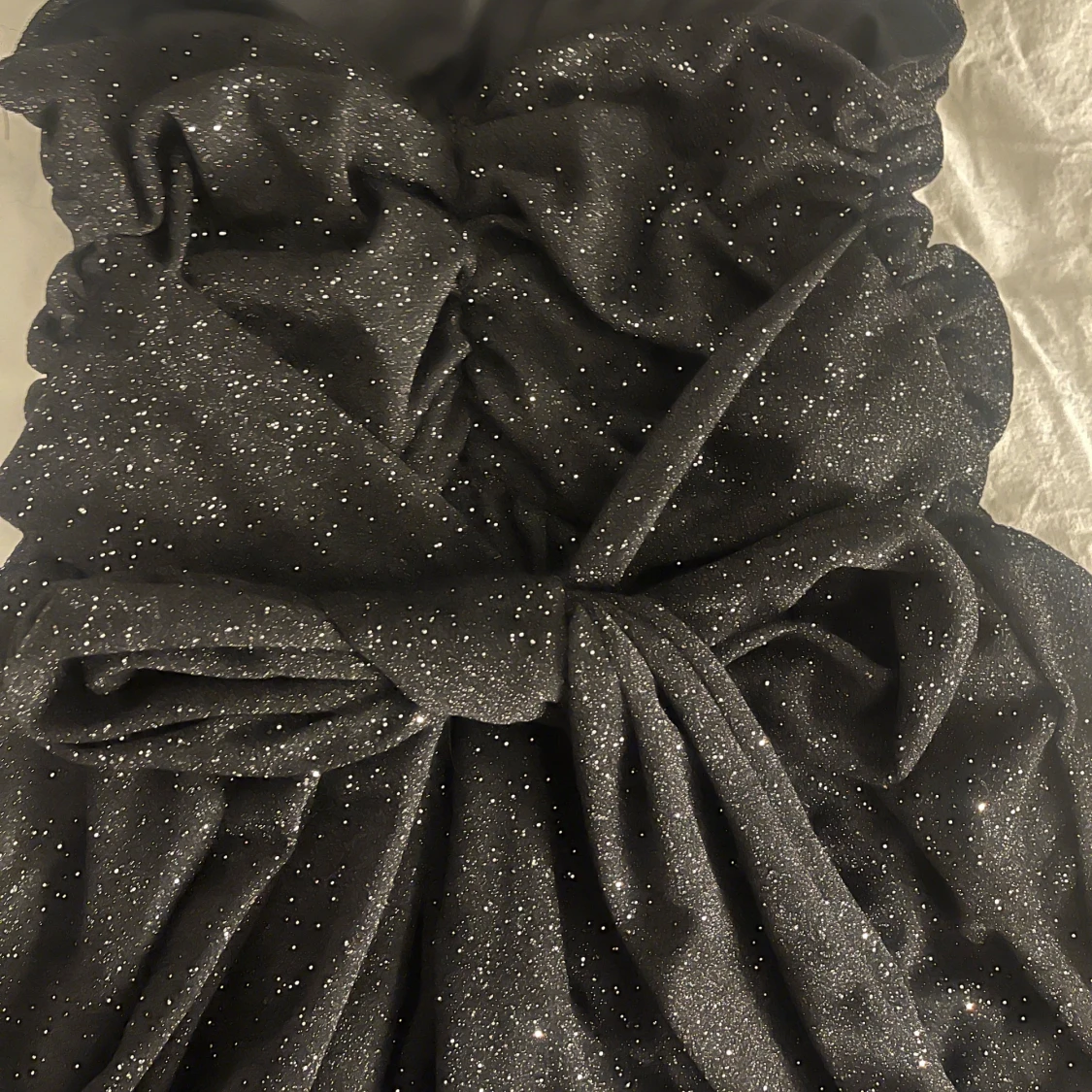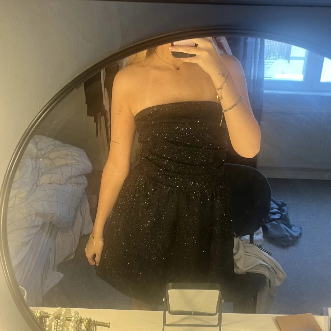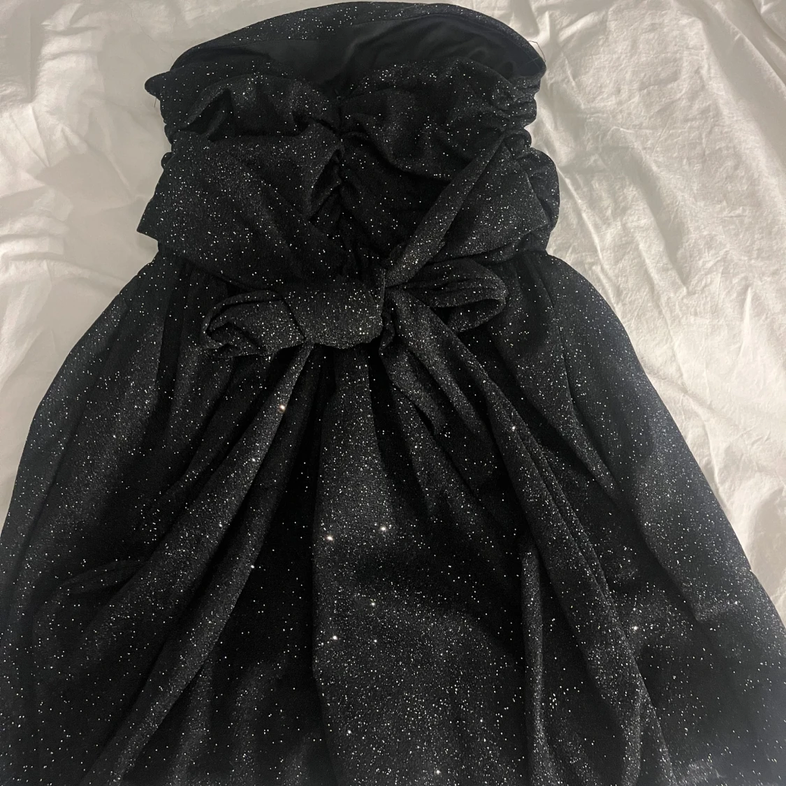 Säljer en superfin svart glittrig klänning som är perfekt till nyår!💕 Den är axelbandslös och har en söt knytning i midjan som ger en fin siluett & en rosett i ryggen✨Endast använt 1 gång