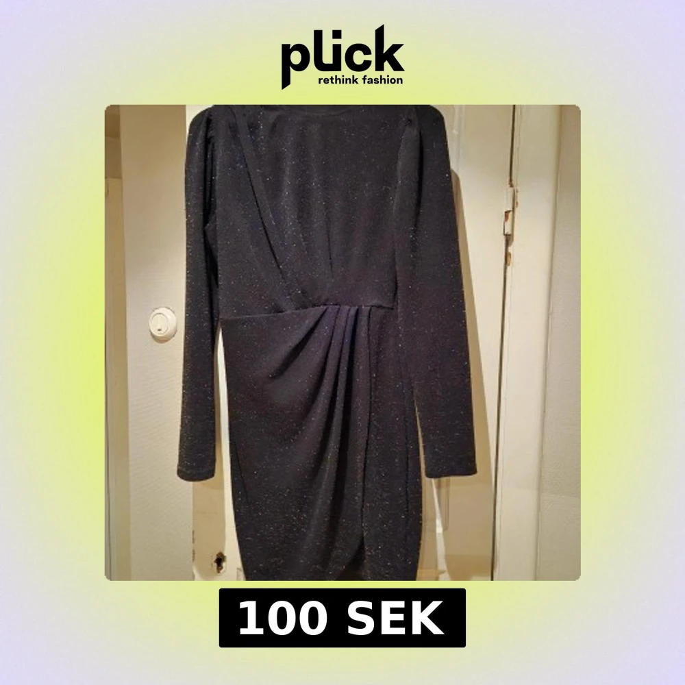 Snygg svart klänning från Shein med glittrigt material och draperad detalj framtill. Klänningen har långa ärmar och en elegant passform som passar perfekt för festliga tillfällen.