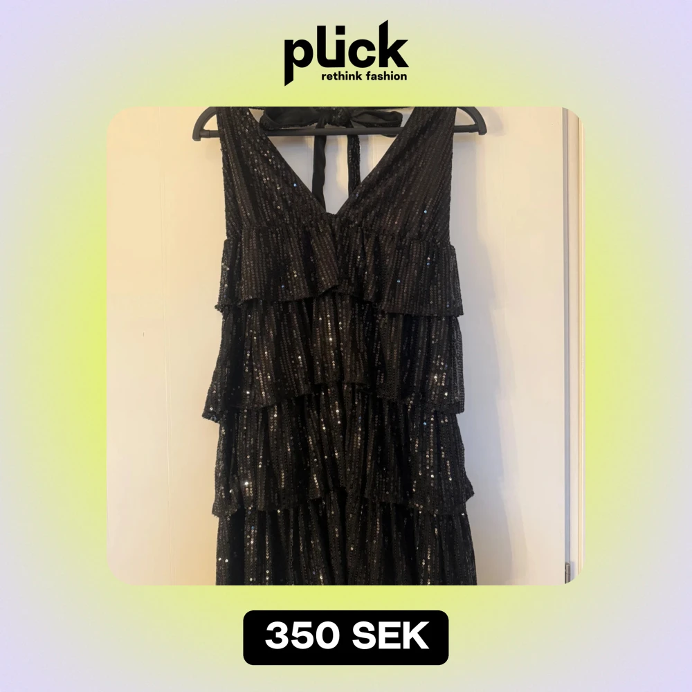 Säljer en superfin svart klänning från Shein i storlek L. Den har ett glittrigt mönster och volanger som ger en festlig look. Perfekt för nyår eller en annan festlig tillställning. Klänningen är ärmlös och har en v-ringad design med knytning i nacken.
