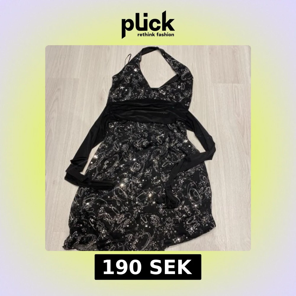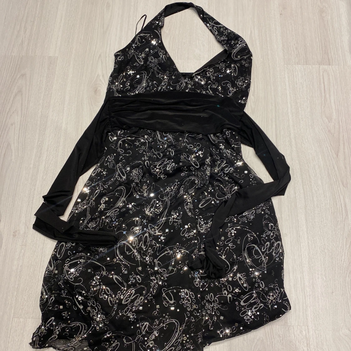 Snygg svart klänning från Sisters Point med glittrigt mönster och halterneck-design. Perfekt för en festlig kväll! Klänningen har en omlott-look och en v-ringad halslinje som ger en elegant touch.