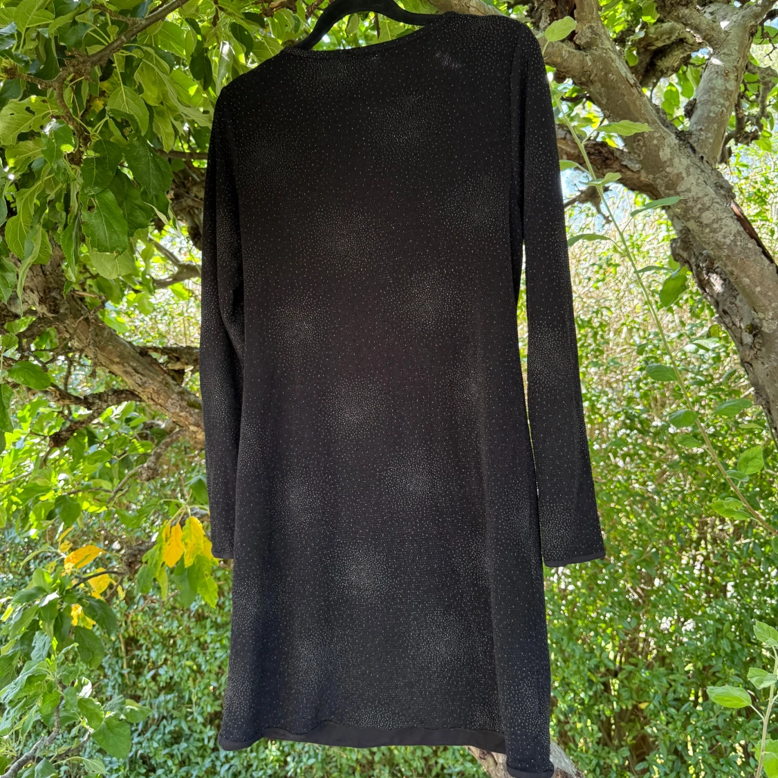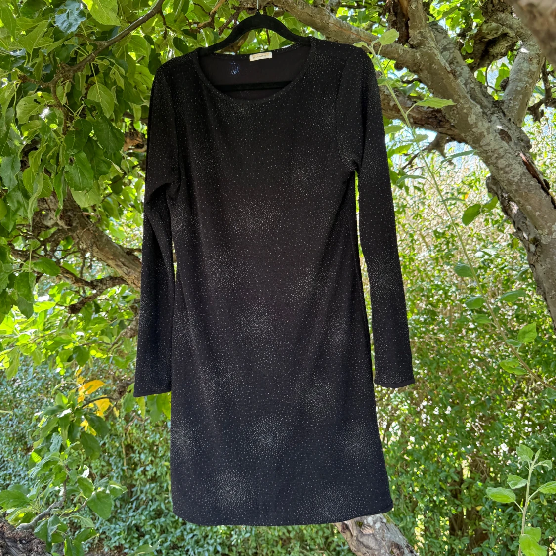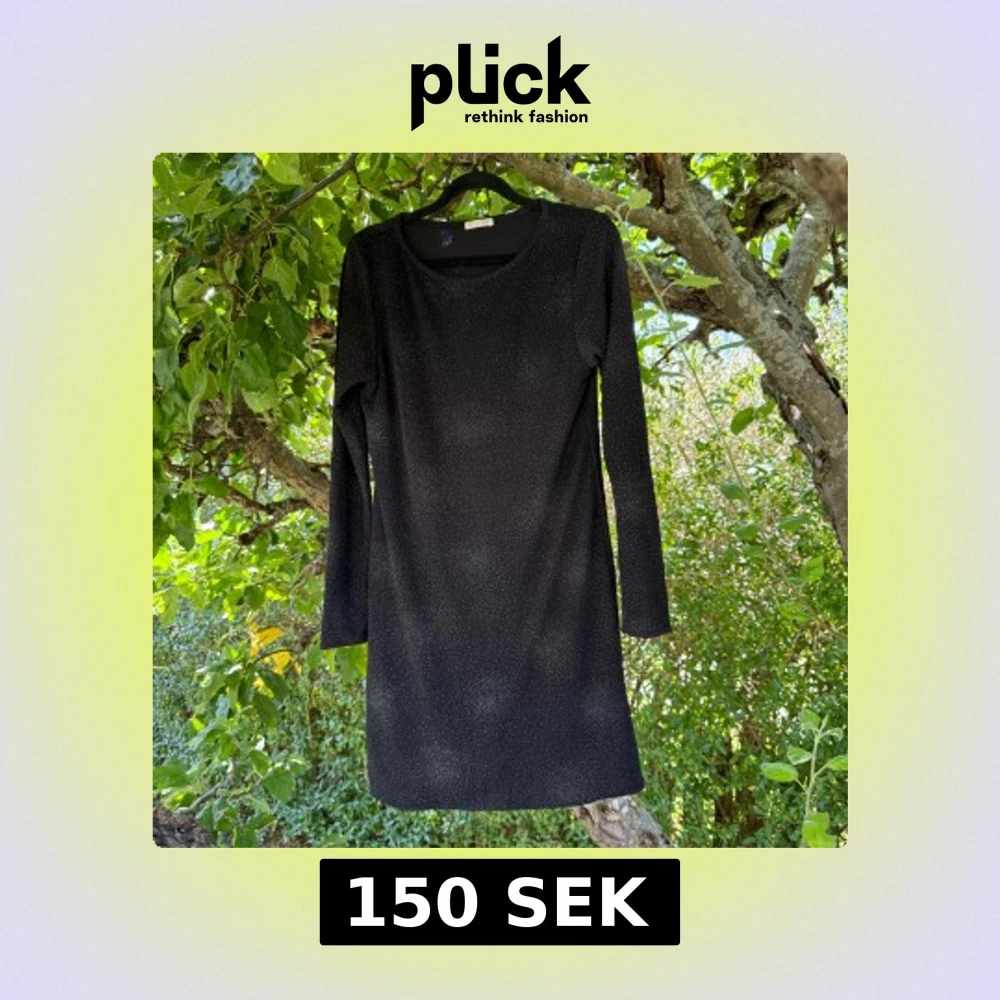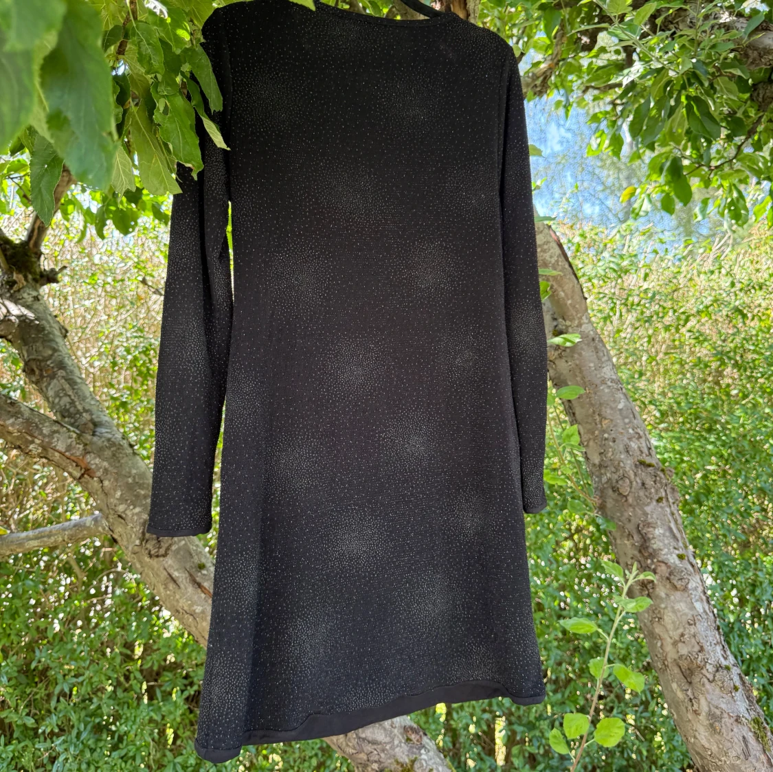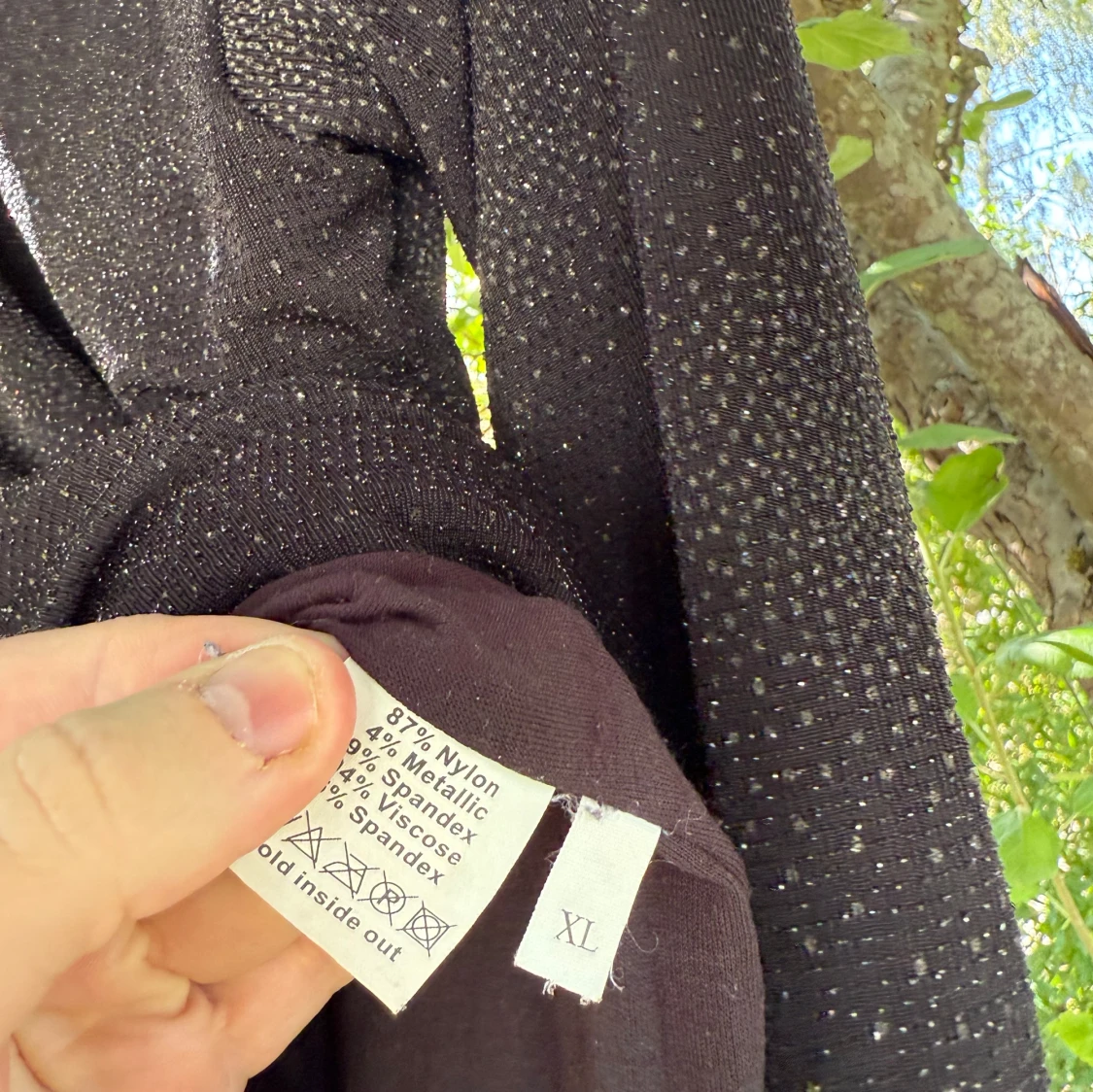 Svart kortklänning från Ida Sjöstedt i storlek XL. Men den är liten i storlek. Mer en M/L. Klänningen har lång ärm och är täckt av små glittriga prickar som ger en snygg shimmer-effekt. Materialet är en mix av nylon, metallisk tråd, viskos och spandex för en stretchig och bekväm passform. Perfekt för dig som gillar att sticka ut. Mycket fint skick, jag hittar inga synliga anmärkningar eller defekter.