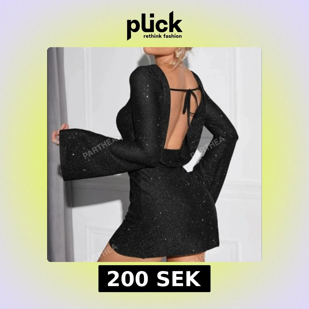 Trendig svart klänning med glittrigt mönster och öppen rygg. Klänningen har långa ärmar och en knytning i ryggen. Perfekt för nyår eller en utekväll😍. Den är helt ny med prislapp kvar! Beställde två storlekar därav säljer jag denna.