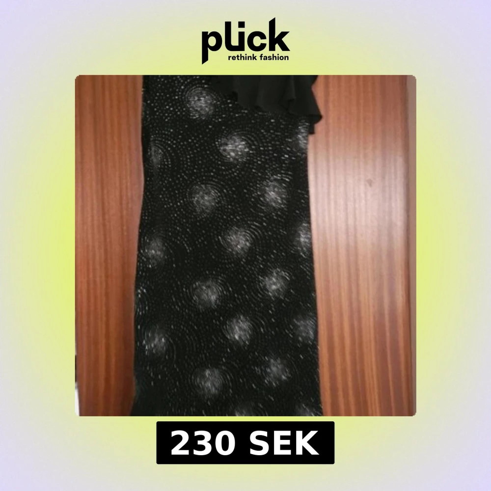 Snygg svart klänning med glittrigt mönster och volangdetalj vid axeln. Klänningen har en elegant passform och är perfekt för festliga tillfällen. Den har en smickrande längd som slutar vid knäna. Står inte vad det är för stl. Jag har M 38 och den passar mig