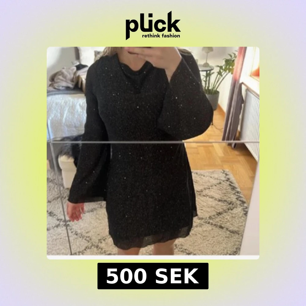 Snygg svart glittrig klänning med långa ärmar och en elegant öppen rygg. Perfekt för en kväll ute eller en speciell tillställning. Klänningen har en kort längd och är tillverkad i ett glittrande material som fångar ljuset vackert. Endast Använd 1 gång.