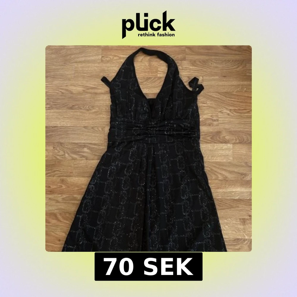 Svart långklänning med halterneck och glittrigt mönster. Djup v-ringning framtill och markerad midja. Klänningen har ett snyggt fall och är perfekt för dig som vill sticka ut med lite extra glitter.