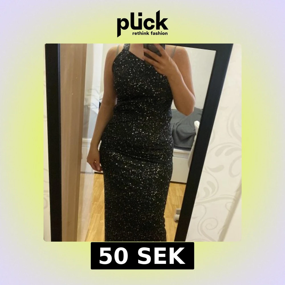 Säljer en svart långklänning med glittriga detaljer och one shoulder-design. Klänningen har en tight passform och är perfekt för festliga tillfällen. Materialet är stretchigt och sitter snyggt längs kroppen.