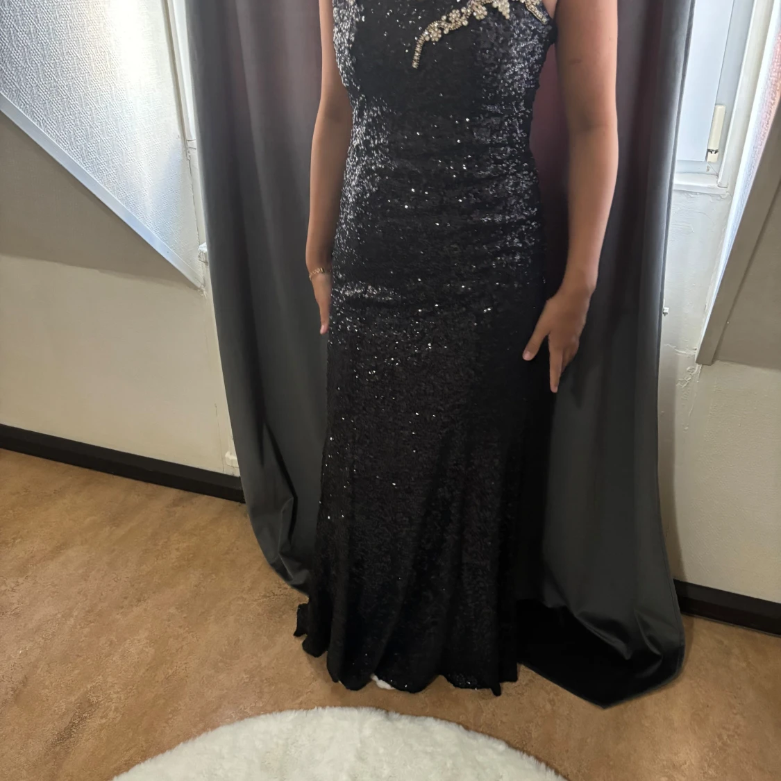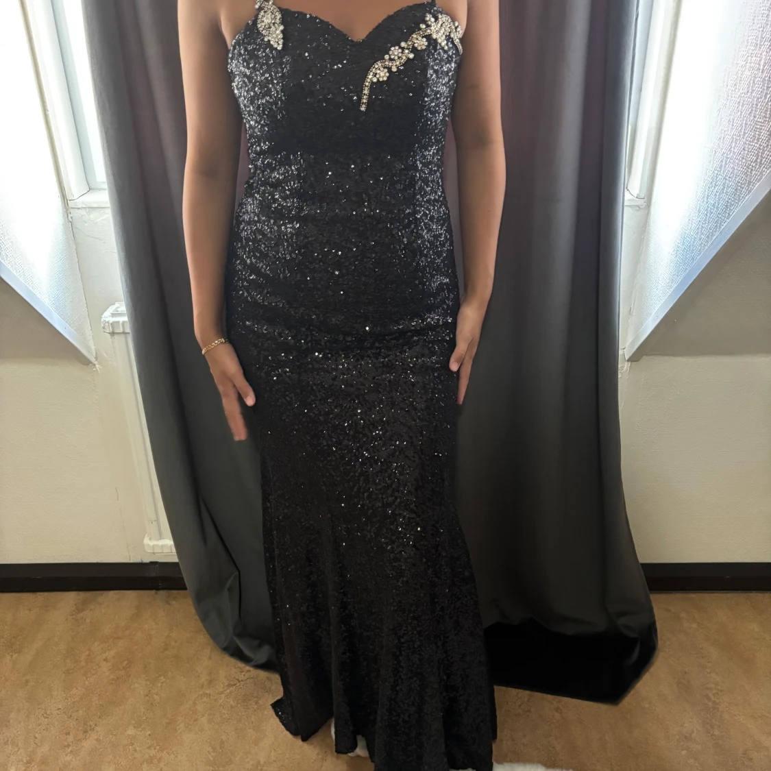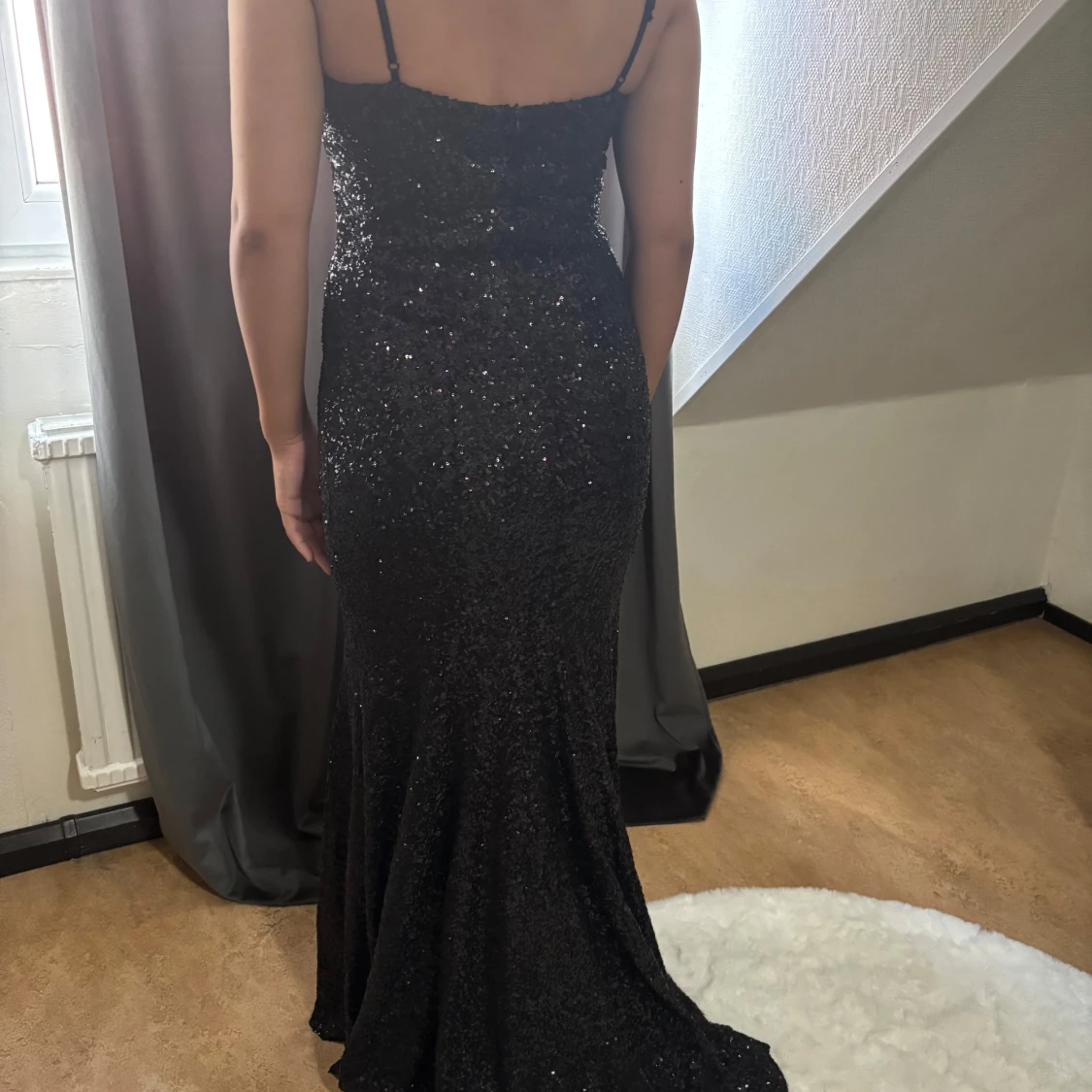 Supersnygg svart långklänning med smala axelband och massor av glittrande paljetter. Klänningen har figurnära passform och v-ringad urringning med dekorativa pärldetaljer upptill. Perfekt för bal eller fest där du vill sticka ut.