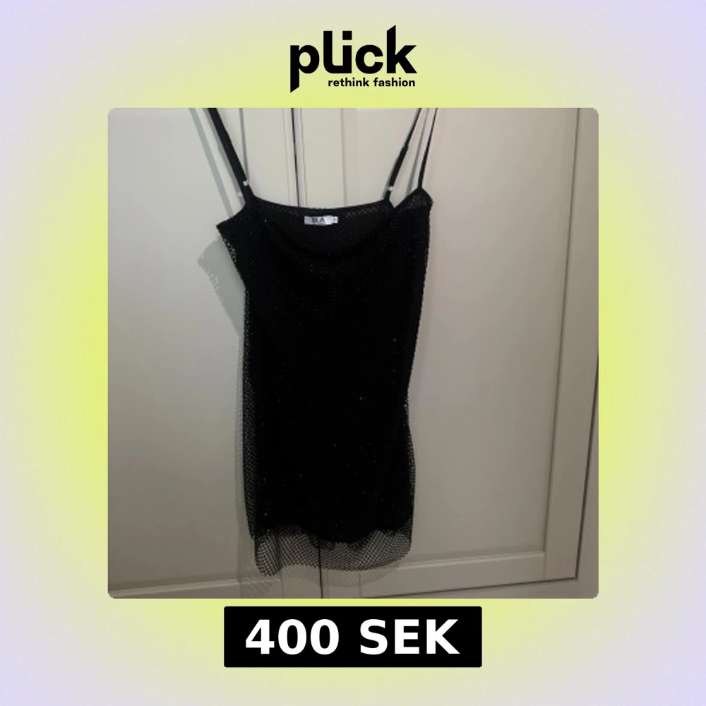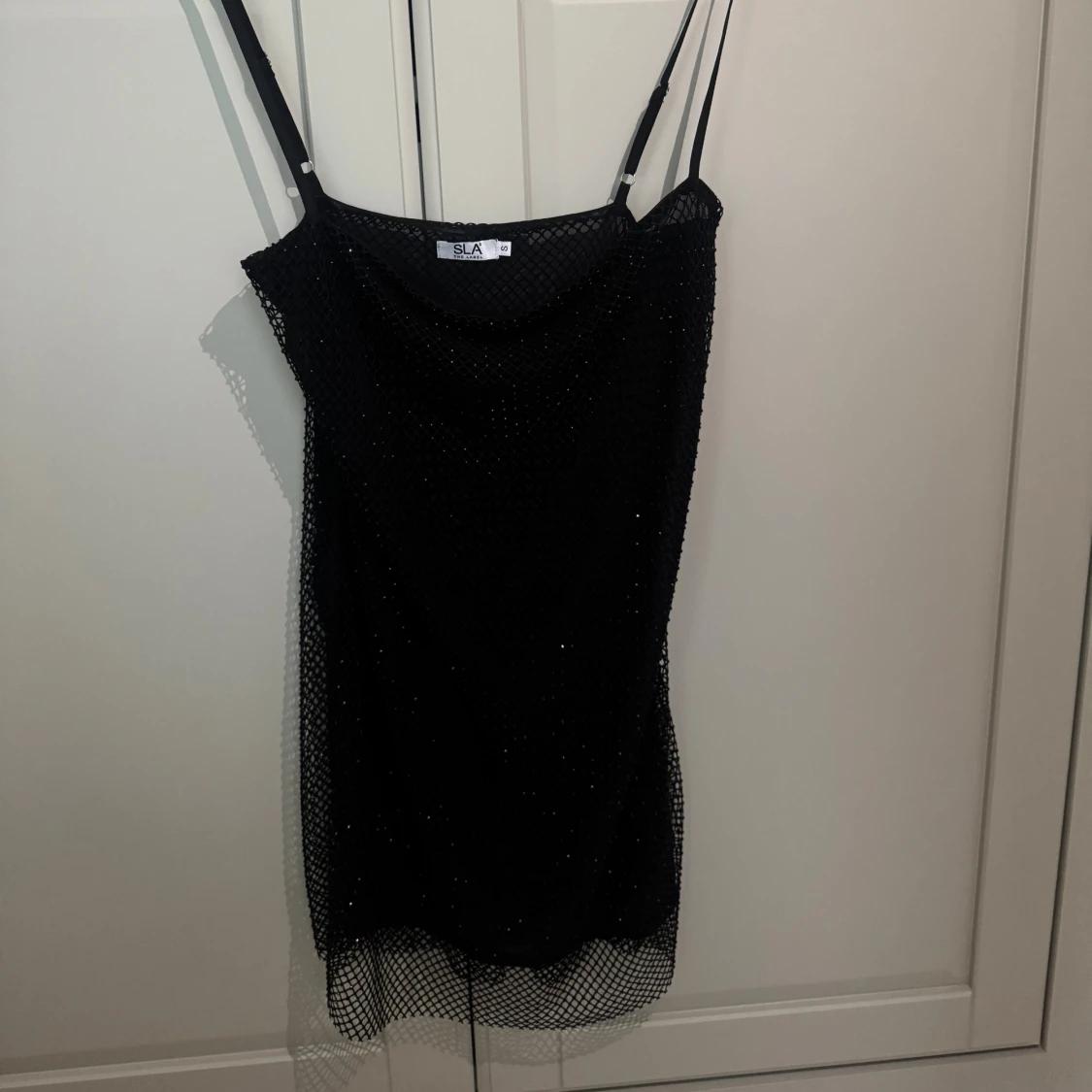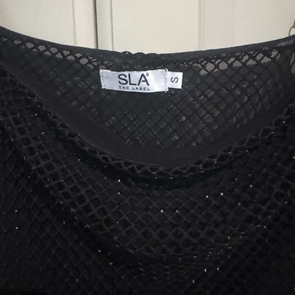 Svart kort klänning från SLA The Label med glittrig mesh över hela och tunna axelband. Klänningen har ett nätmönster och sitter snyggt med en lätt draperad halsringning. Perfekt för dig som vill sticka ut med en cool och trendig look.