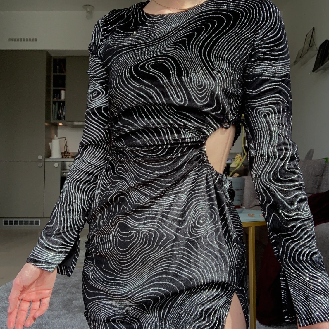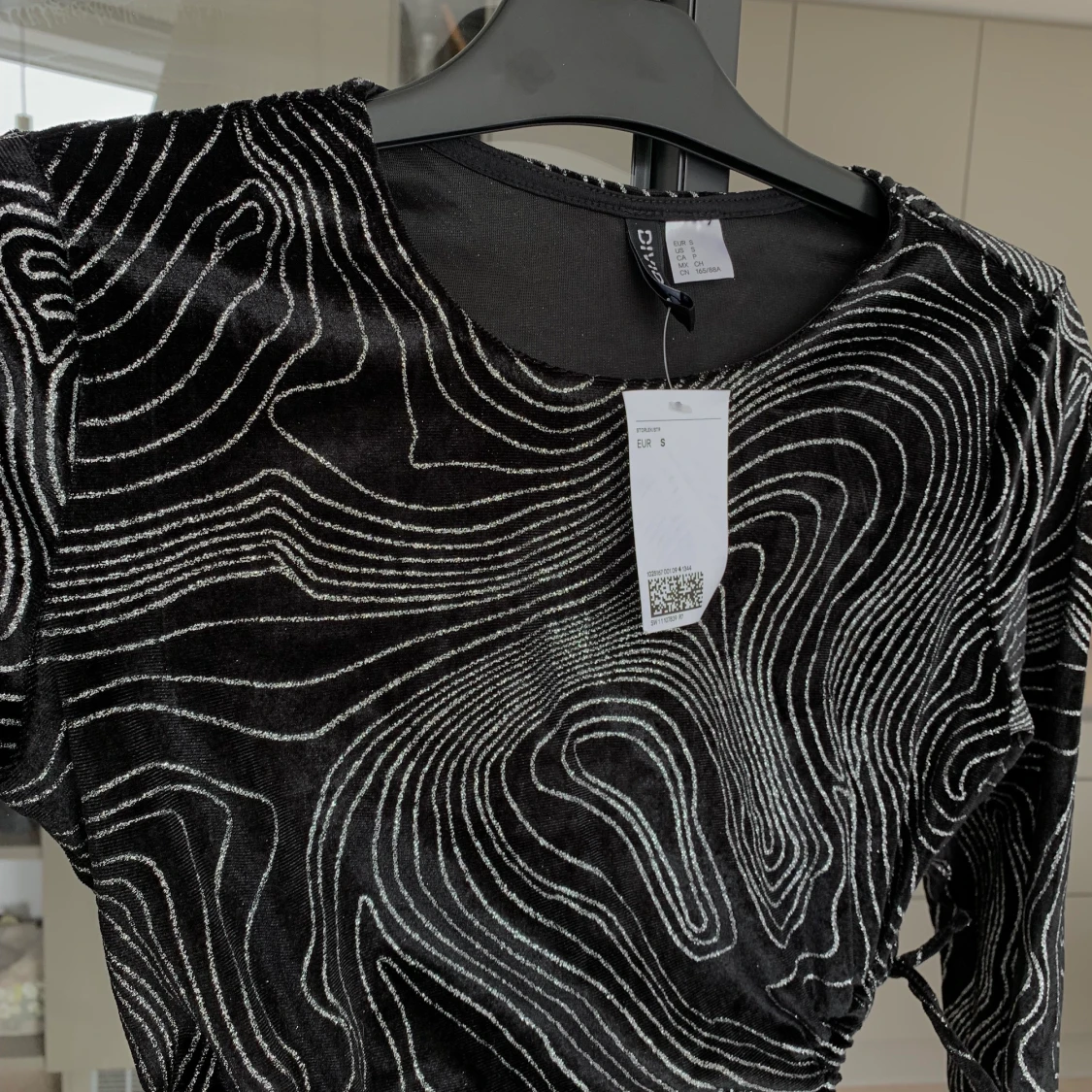 Jag är 165cm och då passar den mig bra. För en längre person blir den troligtvis något kort. Alldeles ny med lapp kvar. Tyg i velvet med glitter. Möts i Sthlm eller så står köparen för frakten.
