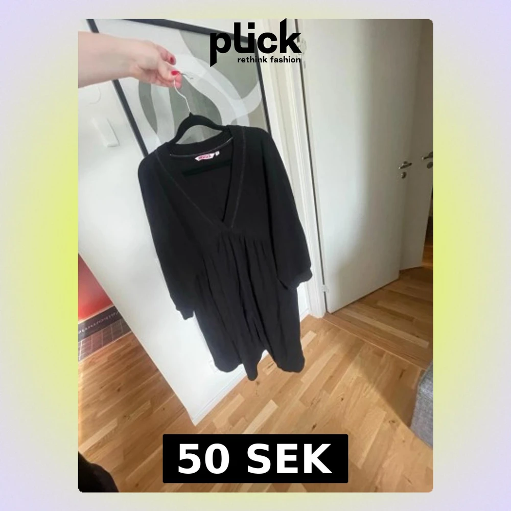 En svart klänning från Indiska i storlek M. Klänningen har v-ringning, långa ärmar och ett löst fall
