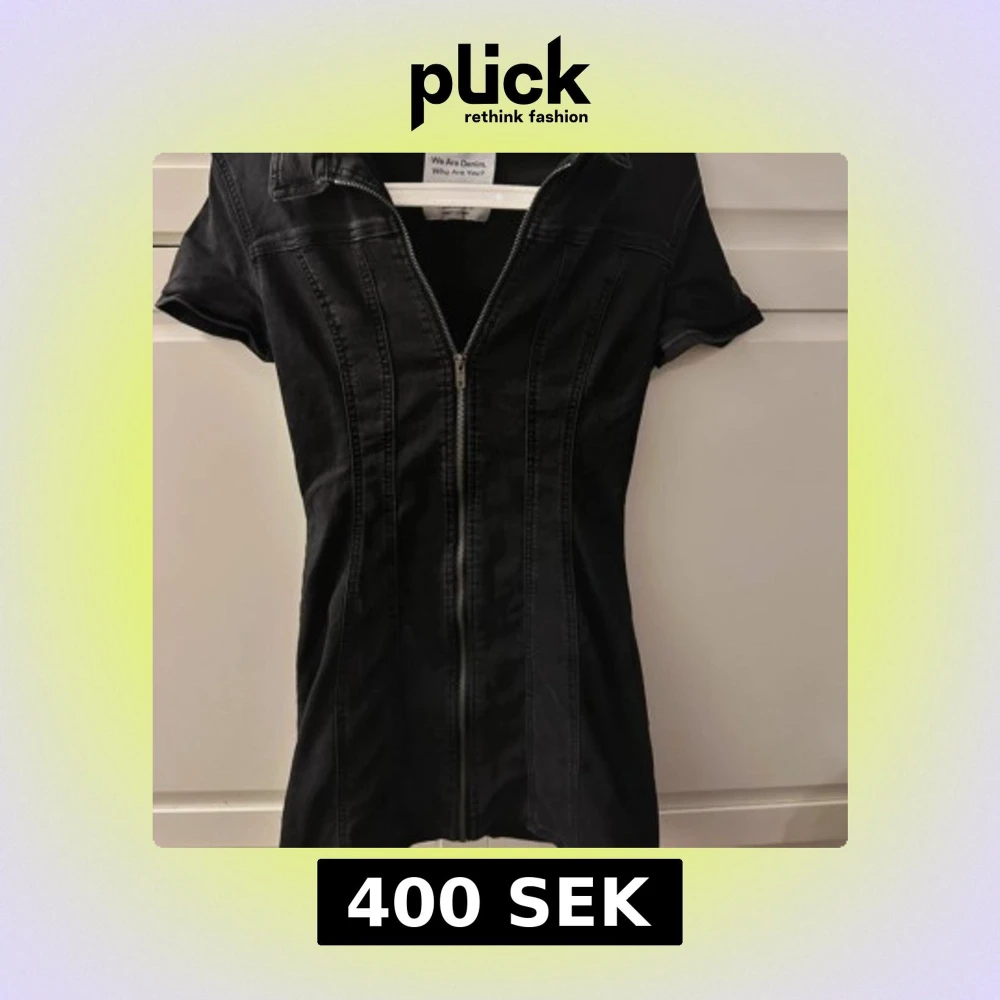 Cool svart kort jeansklänning från Pull&Bear med dragkedja framtill och krage. Knappt använd, skulle säga att den sitter mer som en S!🍒🍒🍒