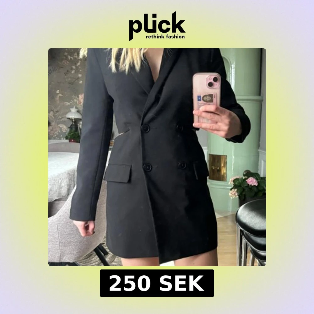 Säljer en svart kavajklänning med markerad midja och cut out-detalj i sidan. Klänningen har dubbelknäppning framtill, klassisk krage och långa ärmar. Bra och rejält material ifrån Strandivarius. Använd 3 sånger och e som nyskick