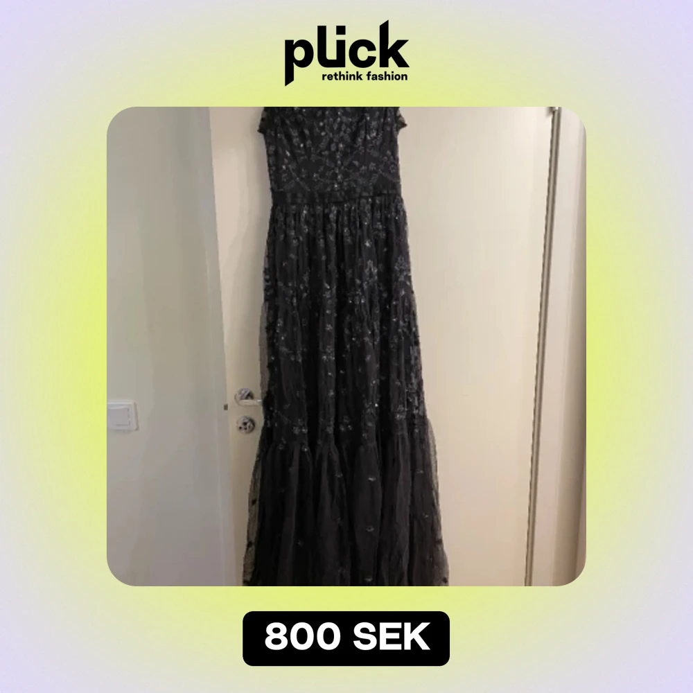 Svart klänning med tyll och blommigt mönster från Needle & Thread, storlek 36. Använd en gång så i mycket bra skick. Se bilder för mått. Omfång vid det svarta bandet (över midjan): 71 cm Nuddar golvet för mig som är 172 cm lång.