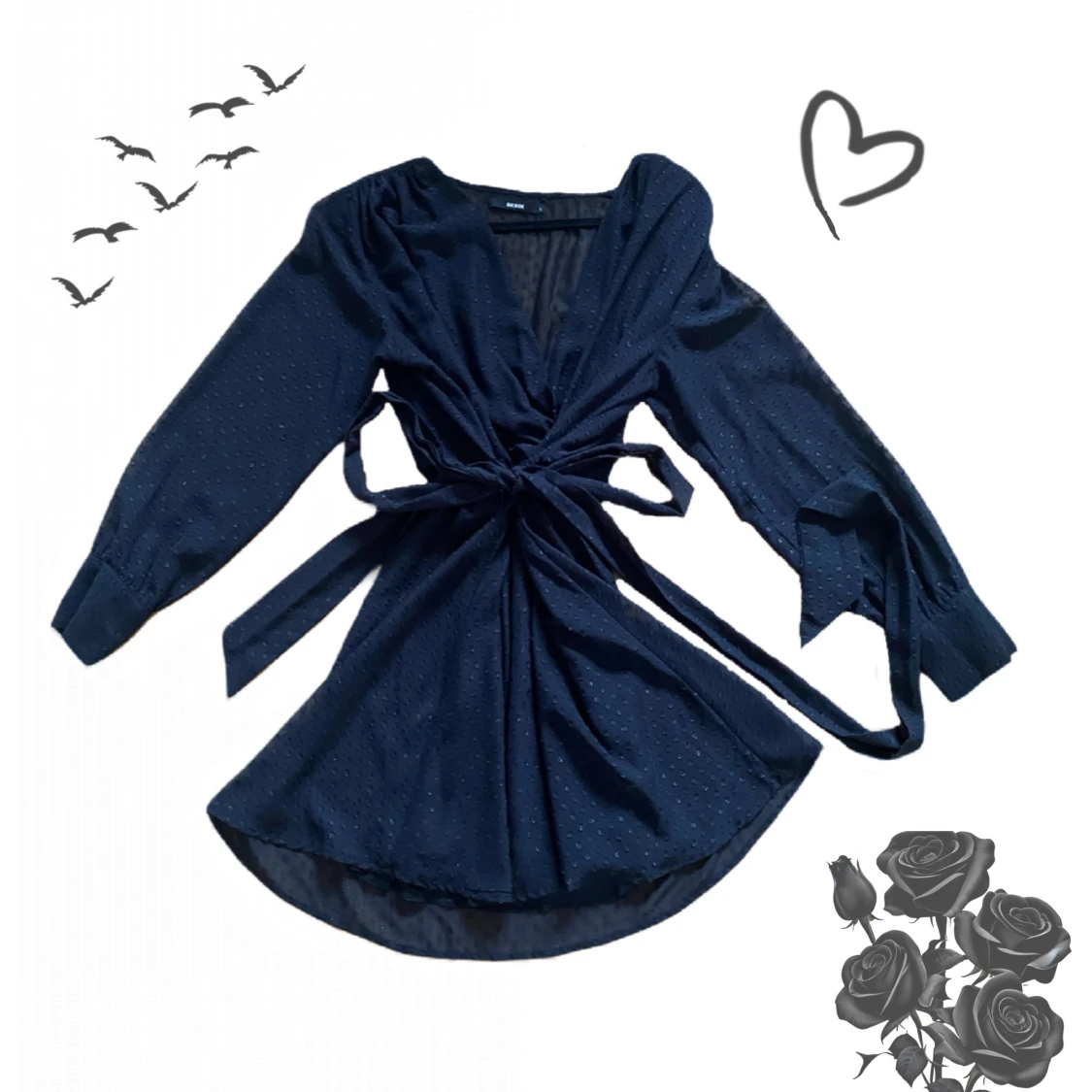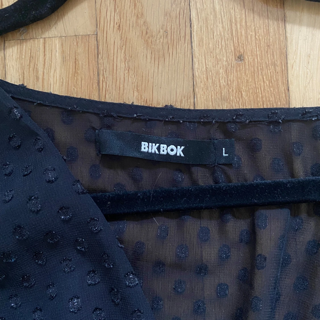 Svart, klänning i strl L från Bikbok med skimrande prickar. Långt snöre att knyta fram eller bak, stretchig i tyget. Använd två gånger och i väldigt gott skick. Skriv gärna för mer bilder! Läs bion innan köp.
