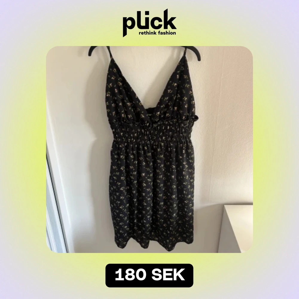 En Svart kort klänning köpt från Shein med små blommor som mönster. Det är storlek L men jag skulle säga att den passar för S och M.