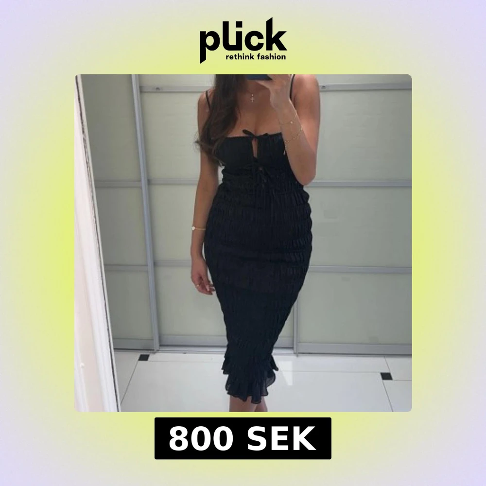 Snygg svart axelbandslös klänning med knytning framtill och volangdetaljer vid fållen. Klänningen har en tight passform som framhäver figuren. Perfekt till mösspåtagningen. Klänningen sitter perfekt på mig som vanligtvis har 36/S, men skulle säga att den även passar 38/M då den är väldigt stretchig! Endas använd 1 gång och finns inga defekter 🩷