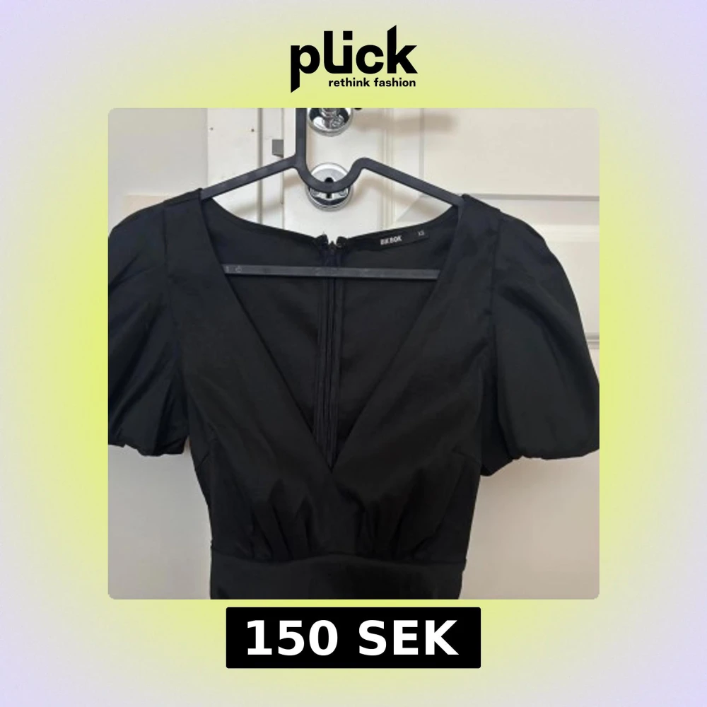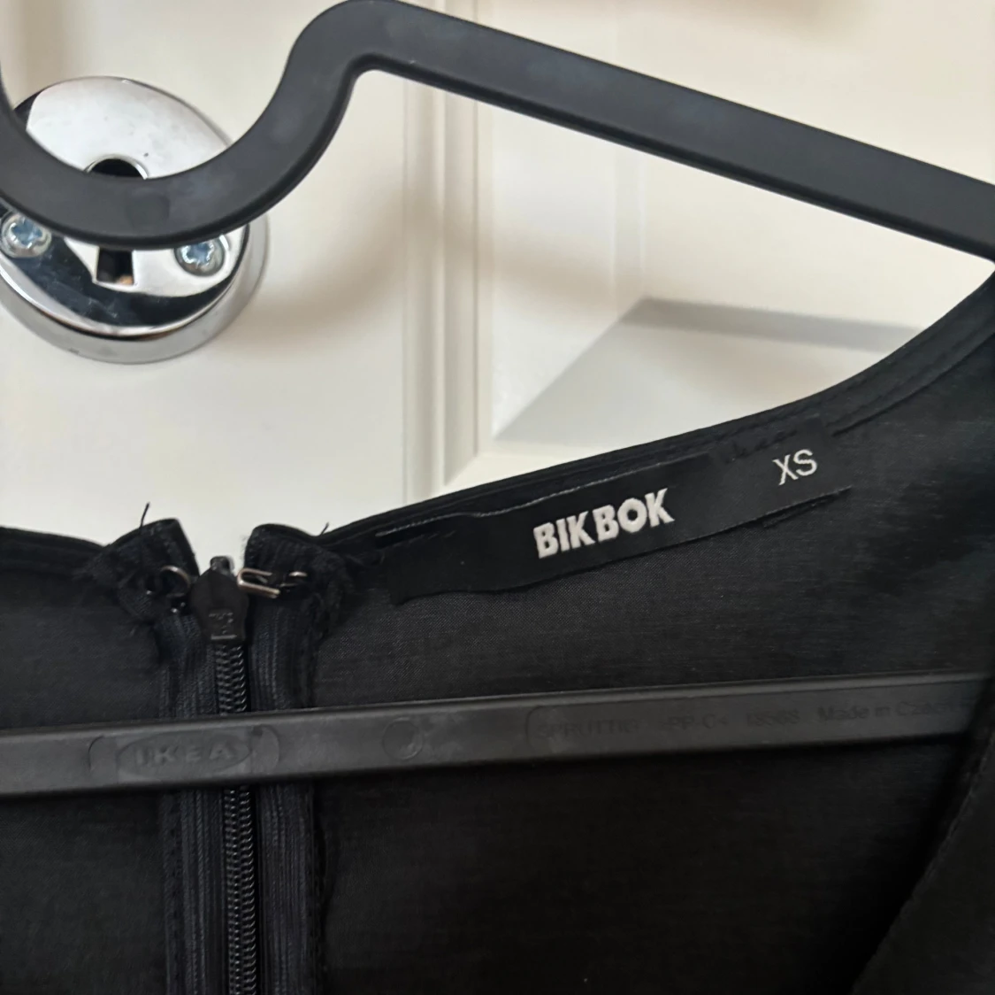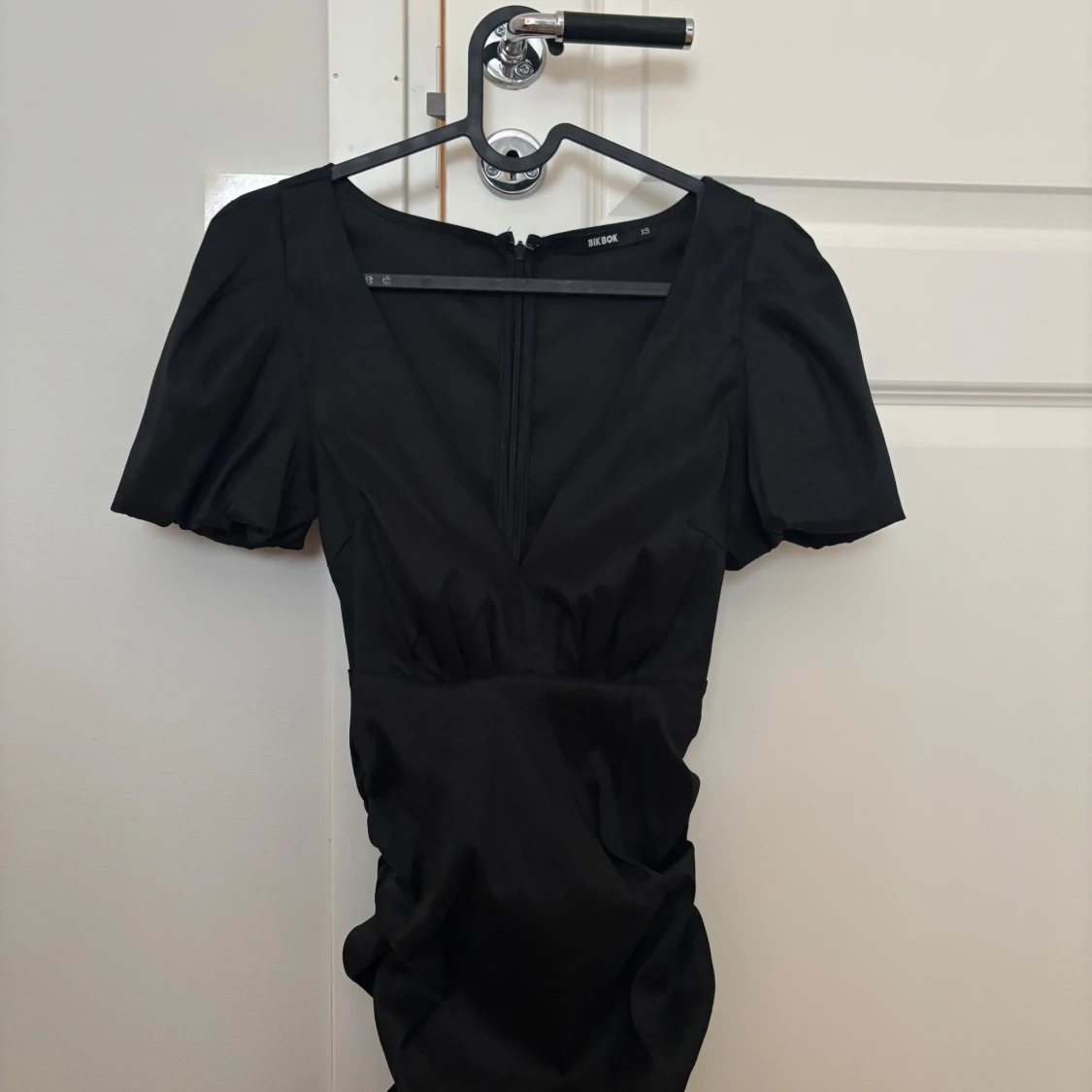Snygg svart klänning från Bik Bok i storlek XS. Den har en v-ringad design med korta ärmar och en dragkedja i ryggen. Perfekt för en stilren look.