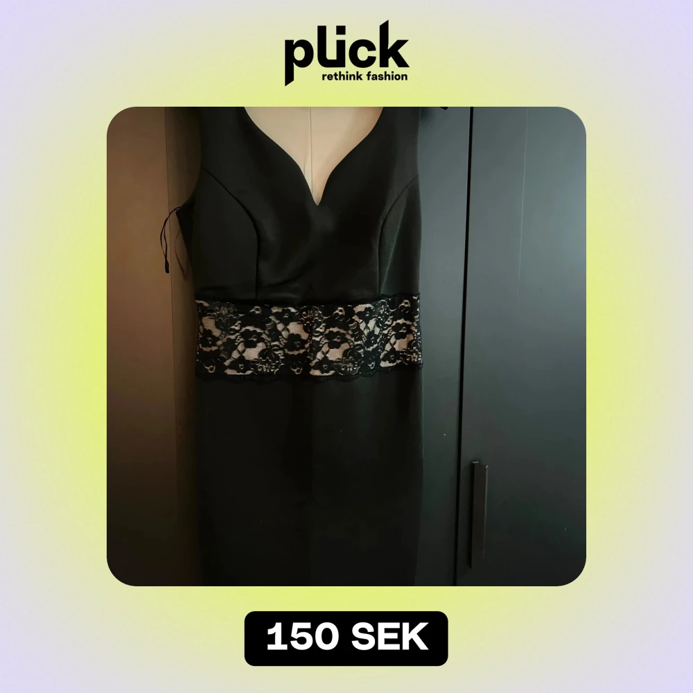 Elegant svart klänning från Bodyflirt med spetsdetaljer i midjan. Den har en v-ringad design och är ärmlös, vilket gör den perfekt för festliga tillfällen. Klänningen är i nyskick och har en figurnära passform.
