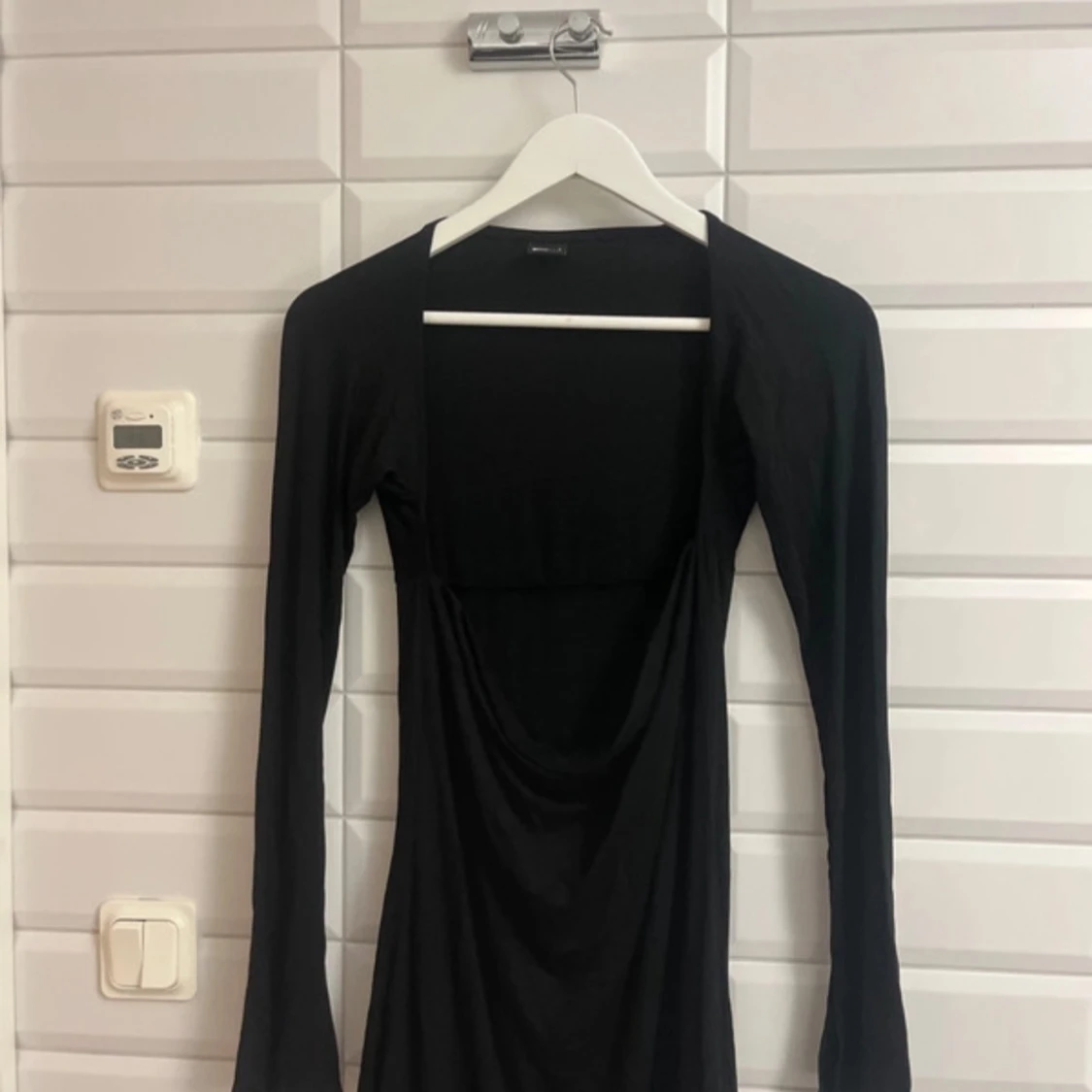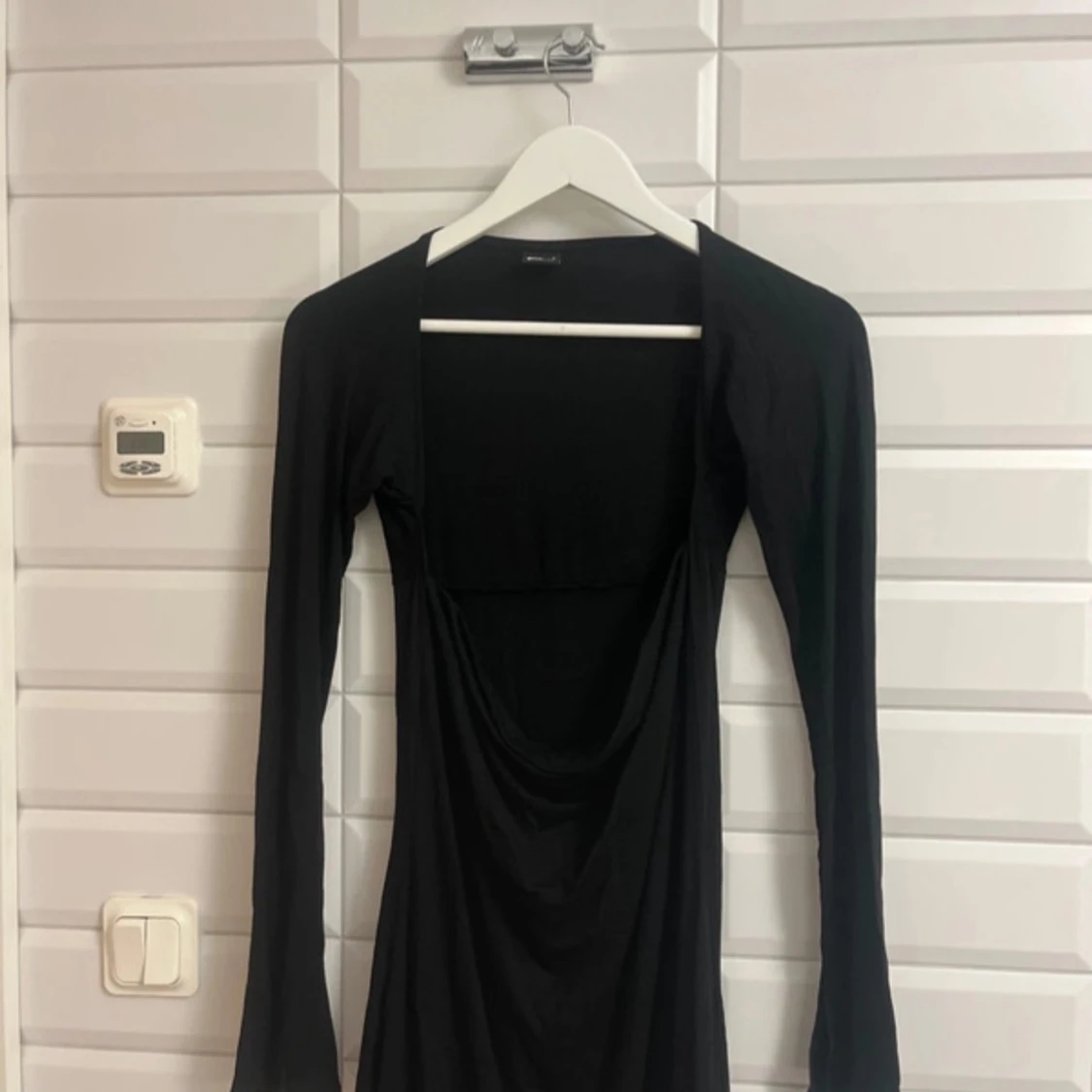 Snygg svart klänning från Gina Tricot med långa ärmar och en stilren design. Perfekt för en elegant look. Klänningen har en draperad detalj framtill som ger en extra touch. Aldrig använd. Säljer för 95 kronor.