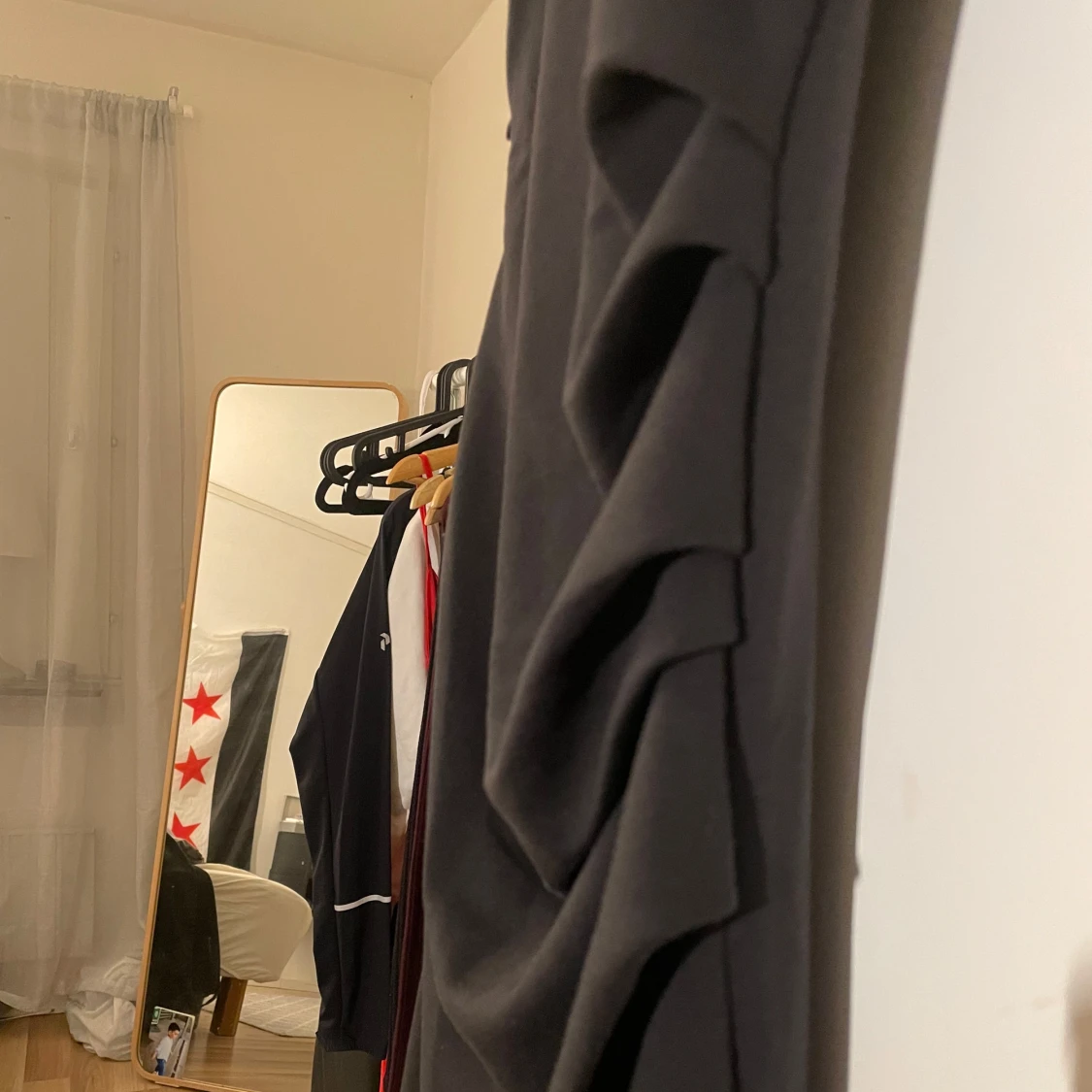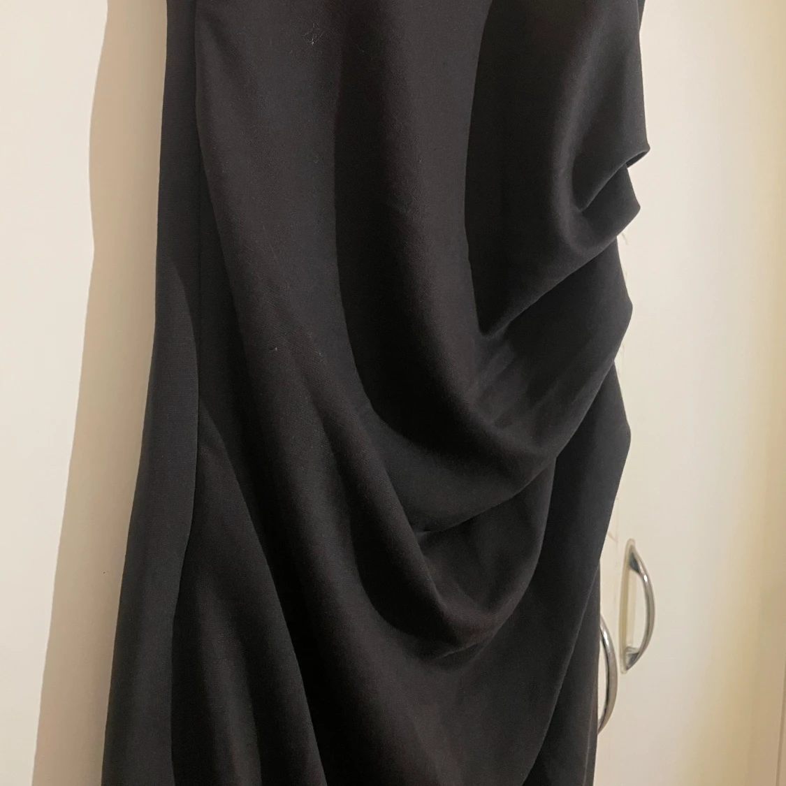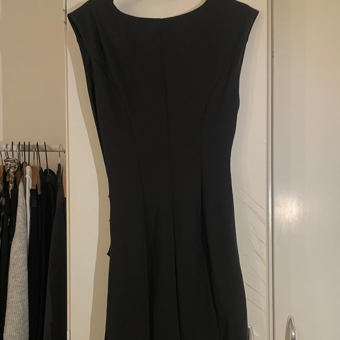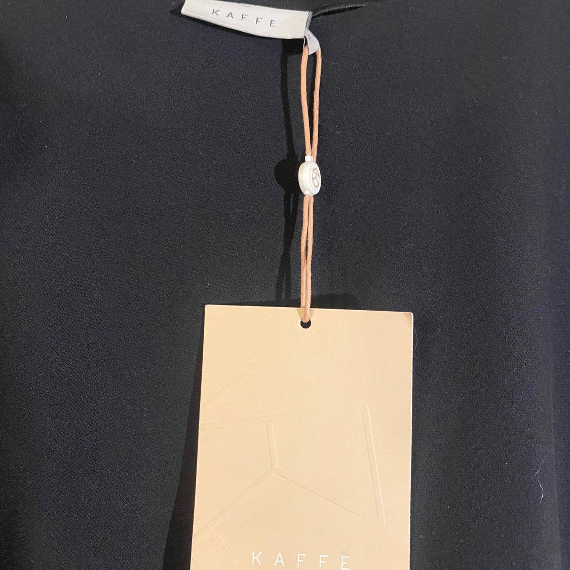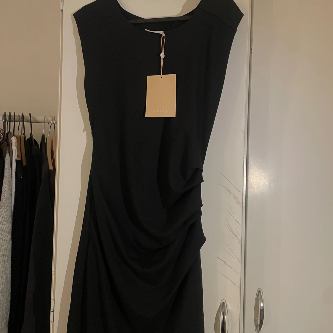Elegant svart klänning från Kaffe med draperad design på sidan. Klänningen har en ärmlös stil och en klassisk rund halsringning. Perfekt för en stilren look.