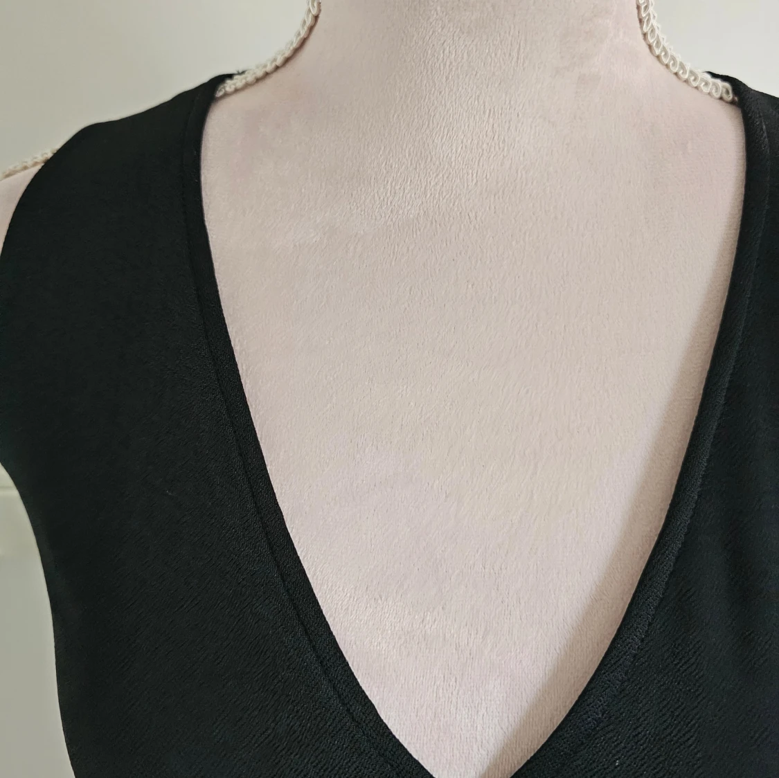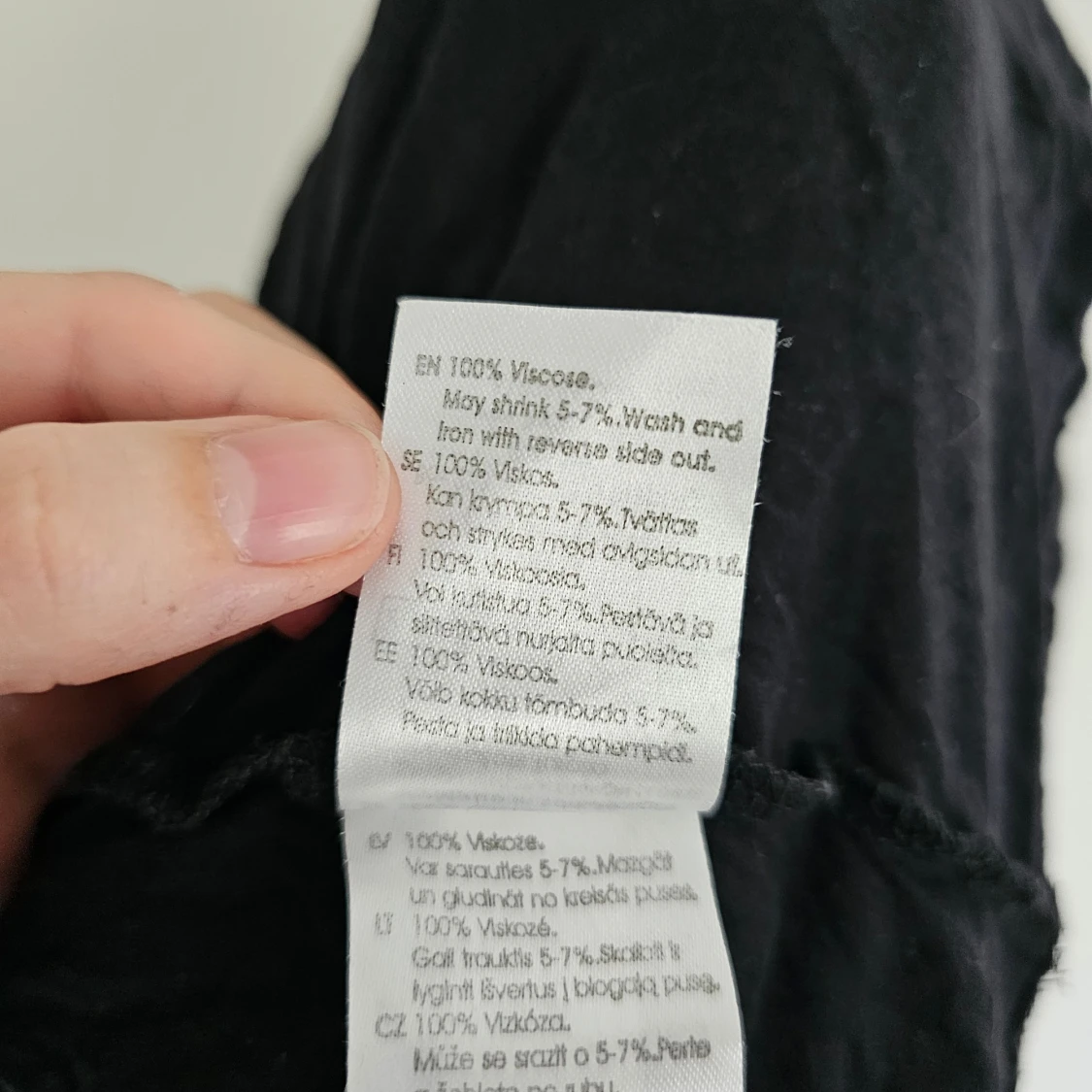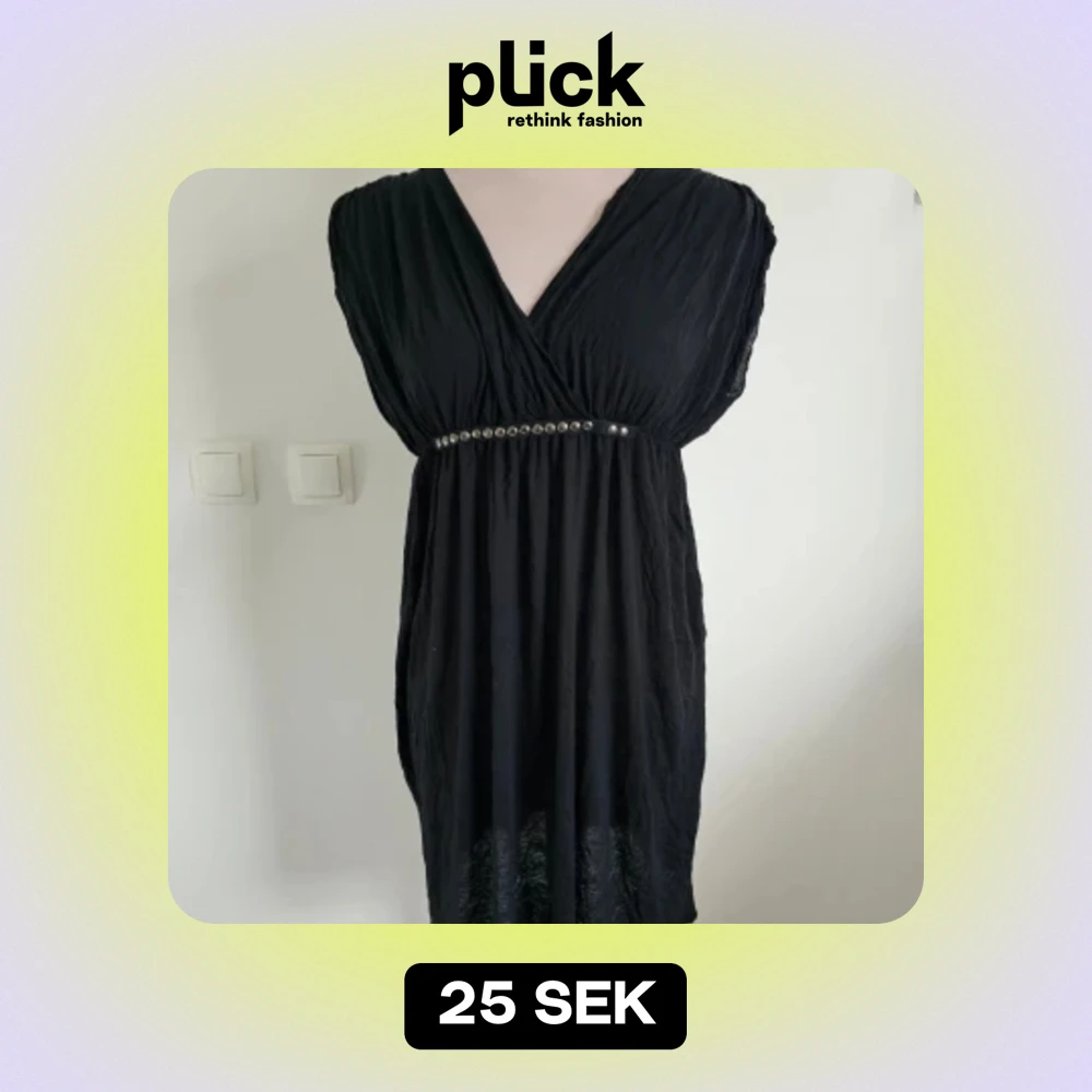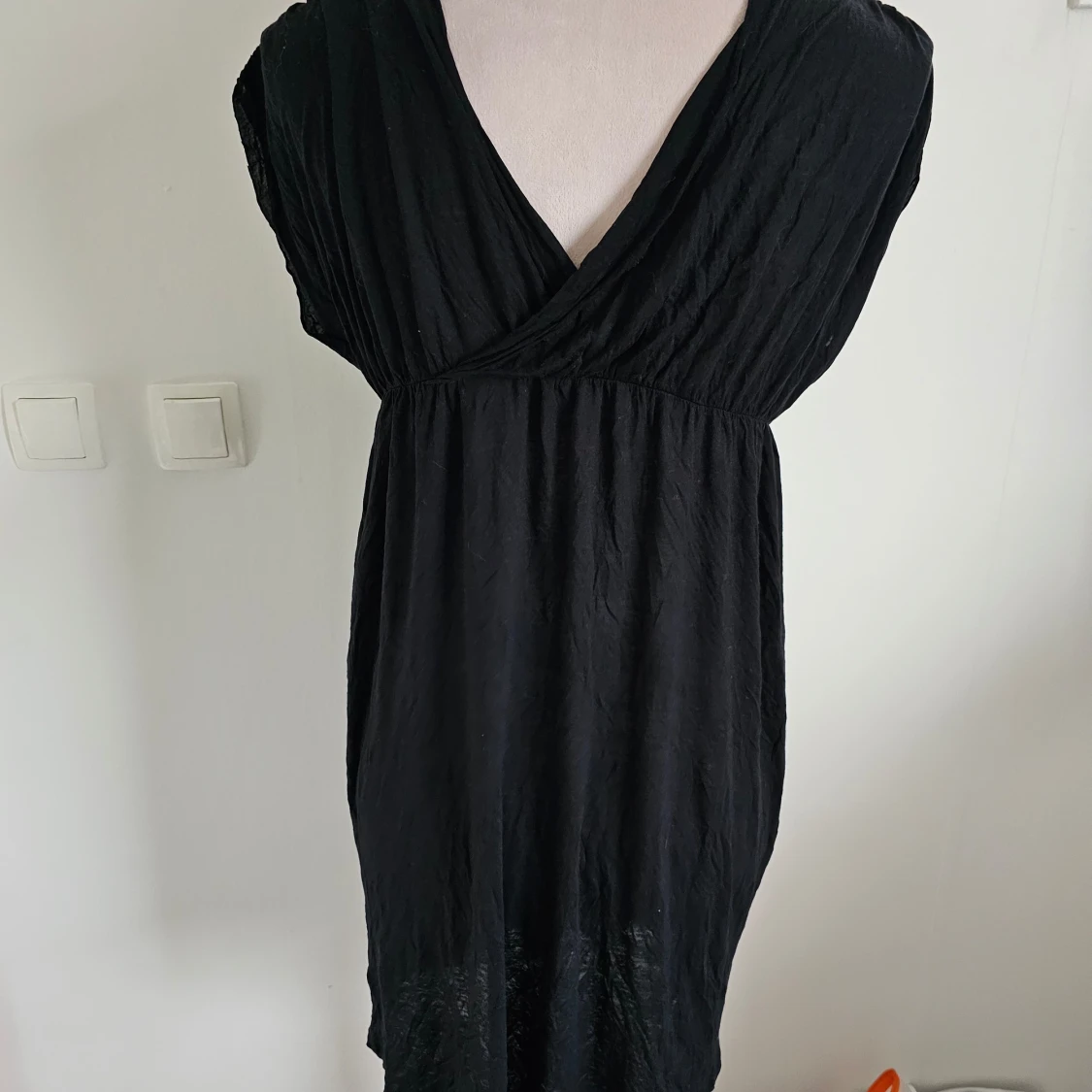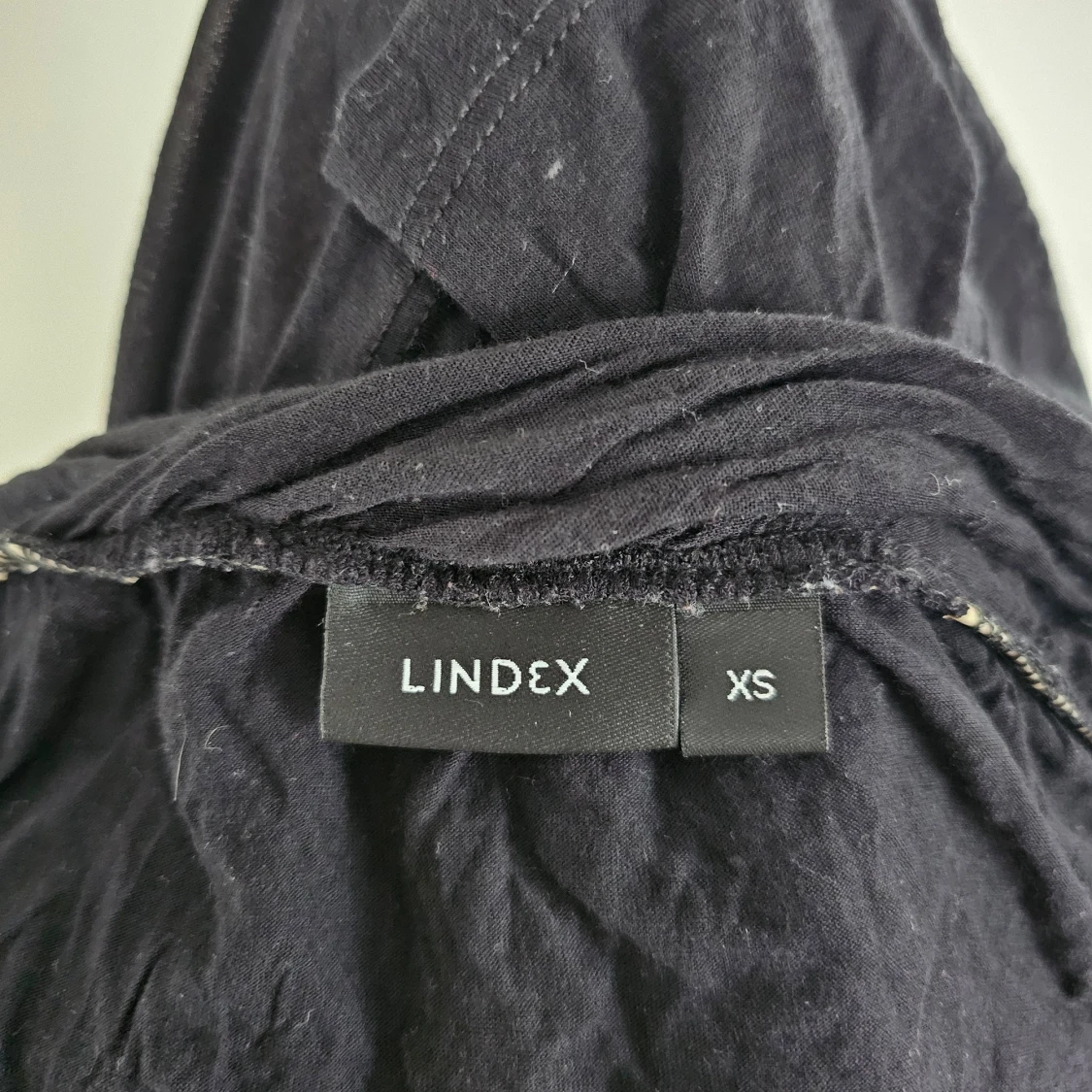 En elegant svart klänning från Lindex i storlek XS. Klänningen har en v-ringad hals och är ärmlös. Den är tillverkad av 100% viskos och har en lös passform med en lätt rynkad midja. Vädligt luftig.