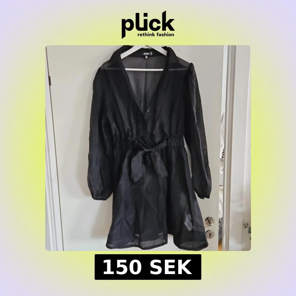 Snygg svart klänning från Missguided med knytband i midjan och långa ärmar. Den har en transparent look och en v-ringad design som ger en elegant touch. Perfekt för att skapa en stilren outfit.