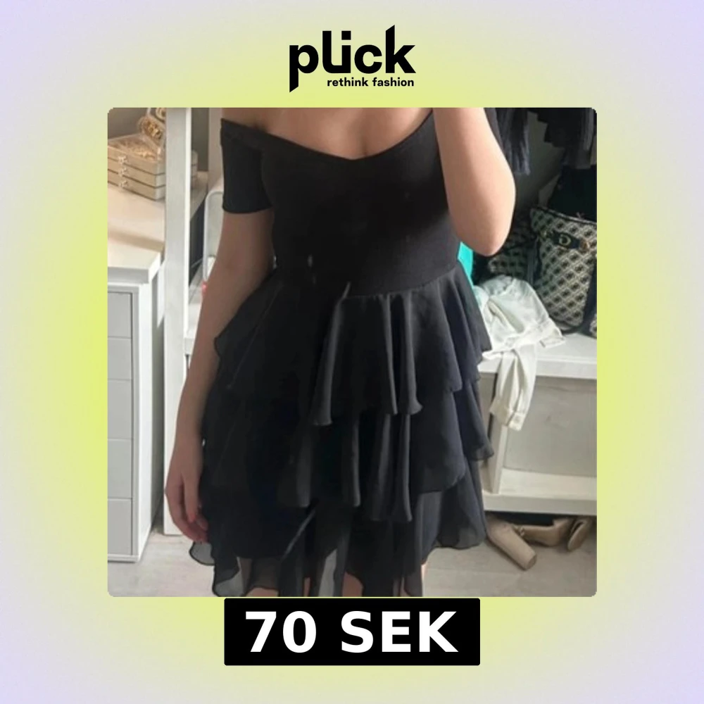 Snygg svart klänning från Oneness med offshoulder-design och volangdetaljer. Perfekt för en kväll ute eller en speciell tillställning.🌸
