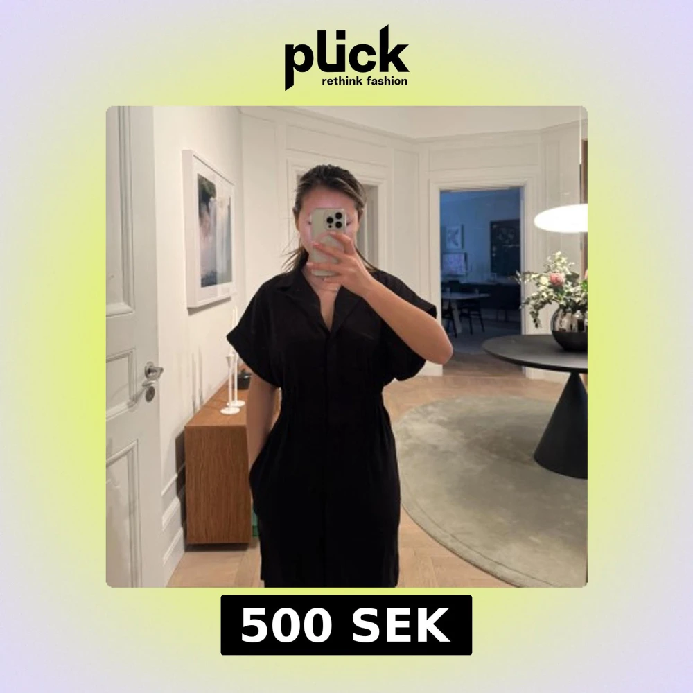 Snygg svart klänning från & other stories med korta ärmar och en klassisk krage. Klänningen har en smickrande passform med resår i midjan och knappar framtill. Perfekt för en stilren look.