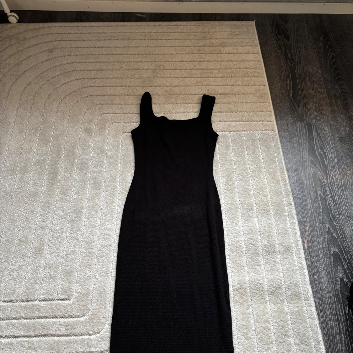 Snygg svart klänning från Shein i en tight passform. Klänningen är ärmlös och har en stilren design som passar perfekt för olika tillfällen. Materialet är mjukt och bekvämt.