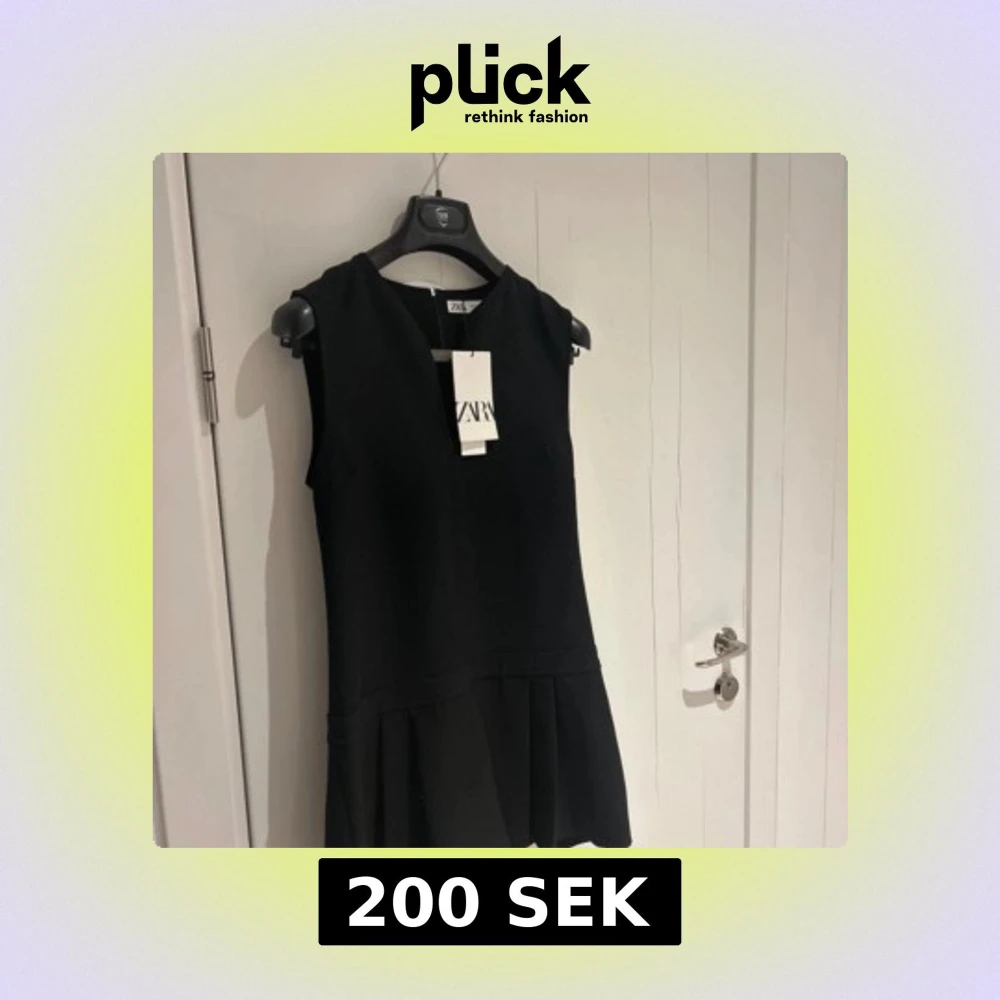 Elegant svart klänning från Zara med en stilren design. Klänningen är ärmlös och har en subtil v-ringad detalj framtill. Perfekt för en chic och minimalistisk look.