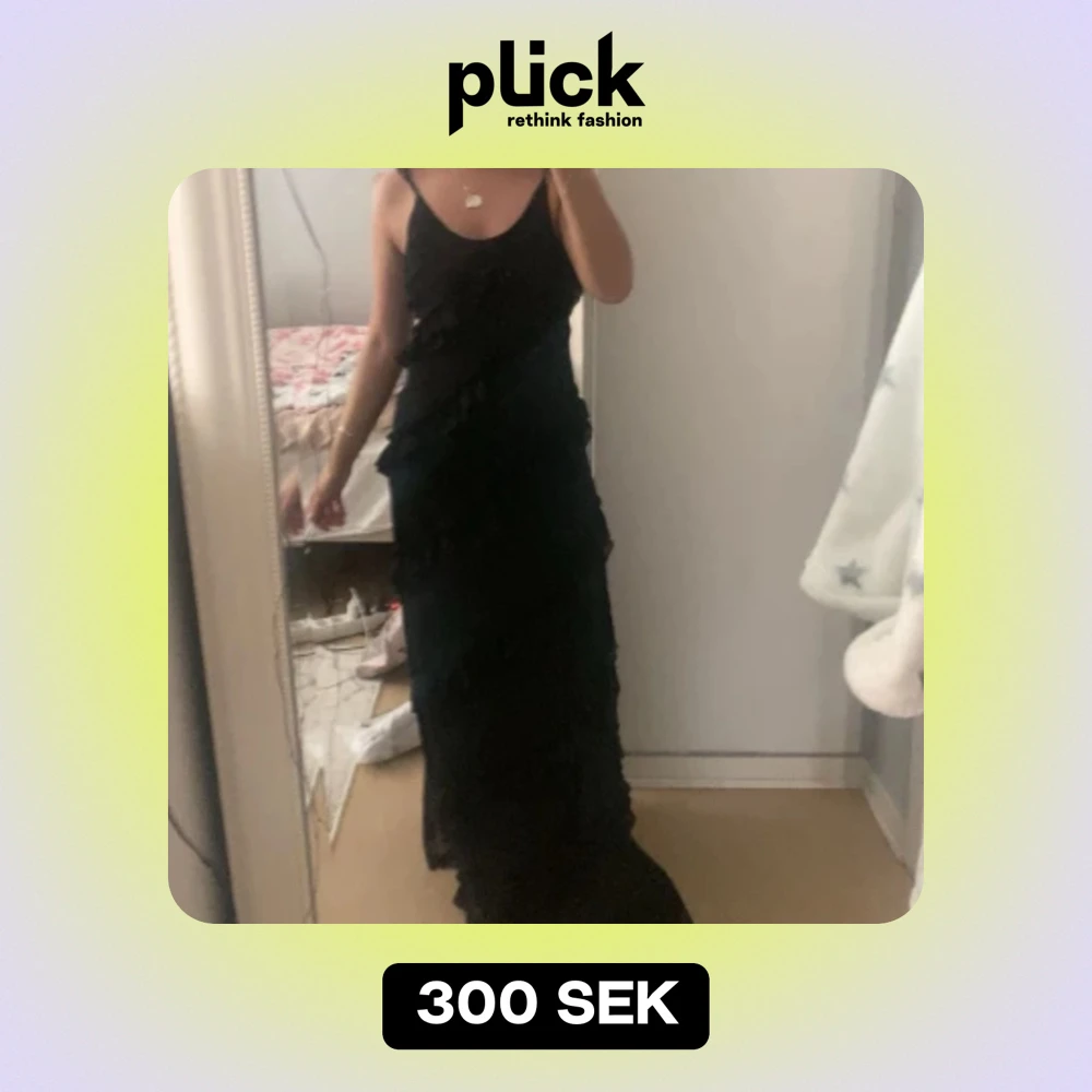 En svart lyxig volang klänning, storlek S. Tjockt tyg och väldigt lyxig, känns dyr. Säljer pga för stor och lång för mig.