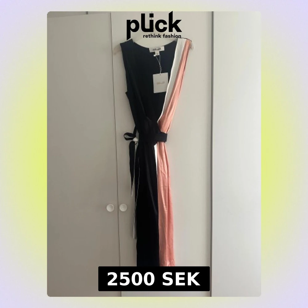 Snygg omlottklänning från Diane von Furstenberg i svart, puderrosa och vit. Klänningen är ärmlös, har omlottdesign med knyt i midjan och är knälång. Materialet är mjukt och har en lyxig känsla, perfekt för dig som gillar stilrena och coola färgblock. Klänningen är i storlek US 8