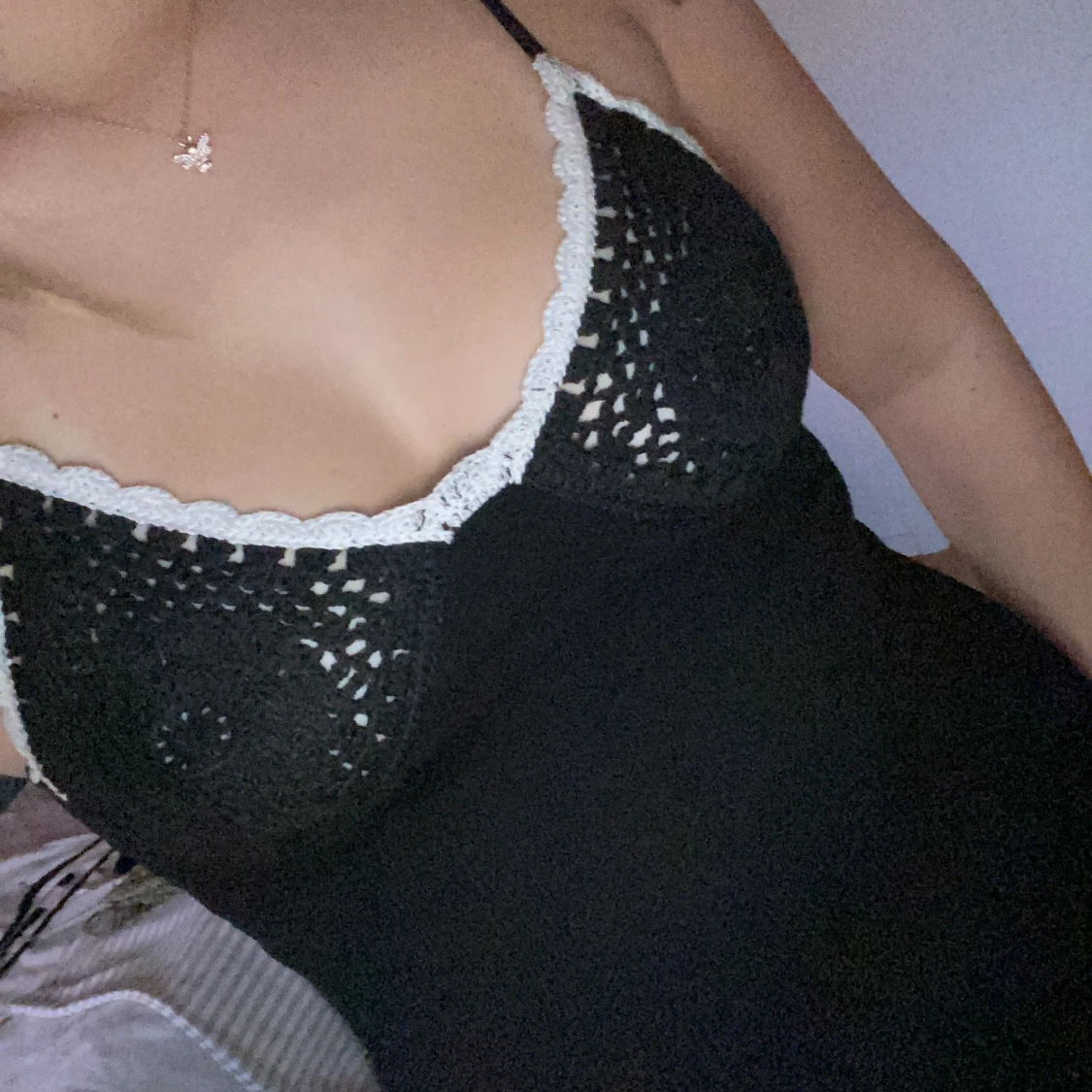 Snygg svart klänning med vit spetsdetalj vid urringningen. Klänningen är ärmlös och har en tight passform som framhäver figuren. Perfekt på sommaren!!🤍