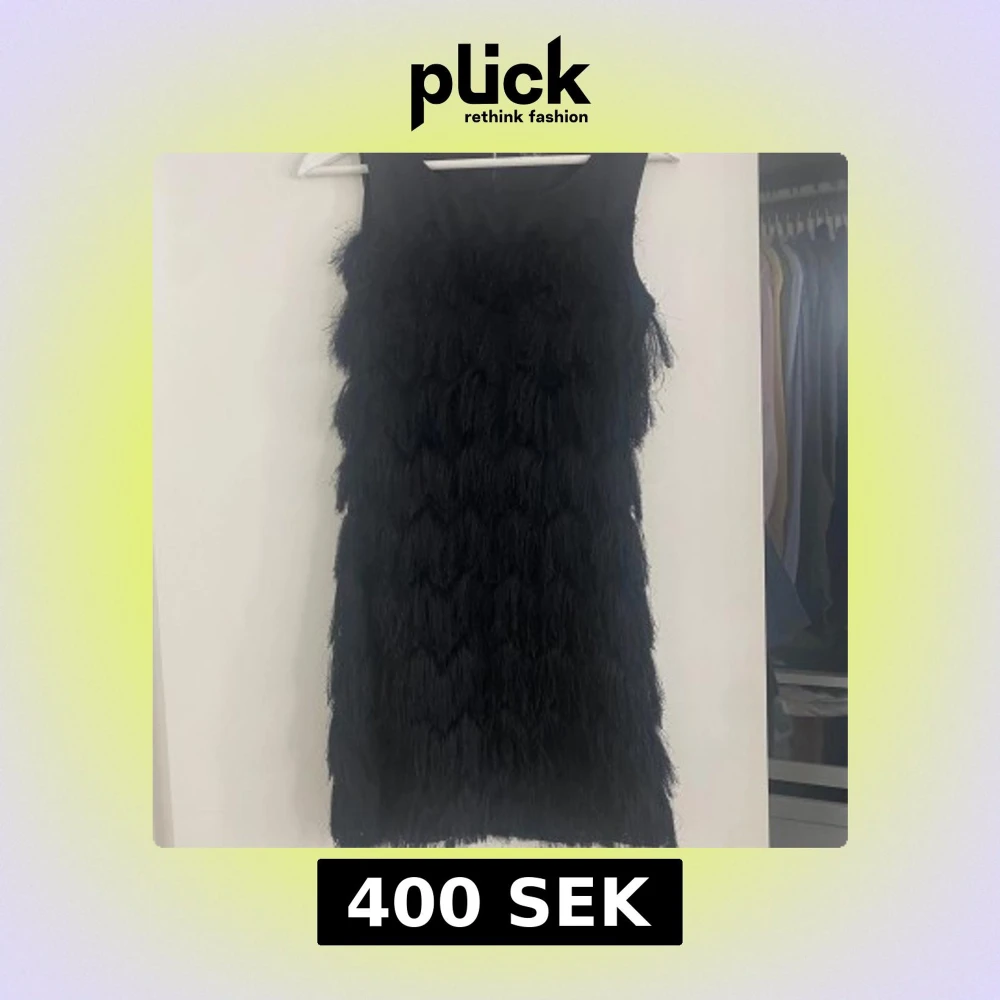 Snygg svart ärmlös klänning med fransar som ger en cool och trendig look. Perfekt för en utekväll eller fest. Klänningen har en rak passform och är knälång.
