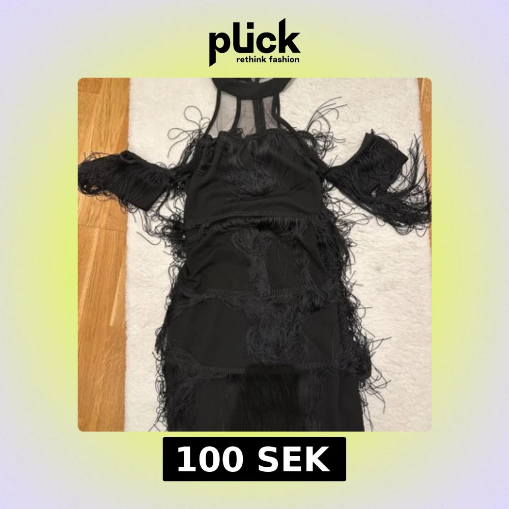 Snygg svart klänning med unika fransdetaljer och offshoulder-design. Perfekt för en kväll ute eller en speciell tillställning. Klänningen har en elegant och modern look med en tight passform.
