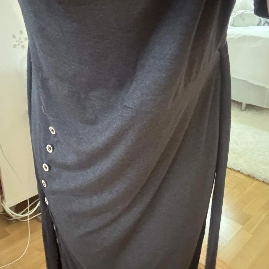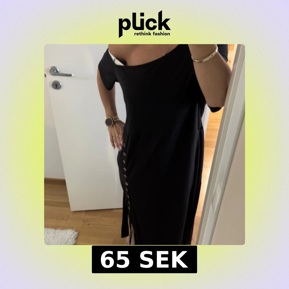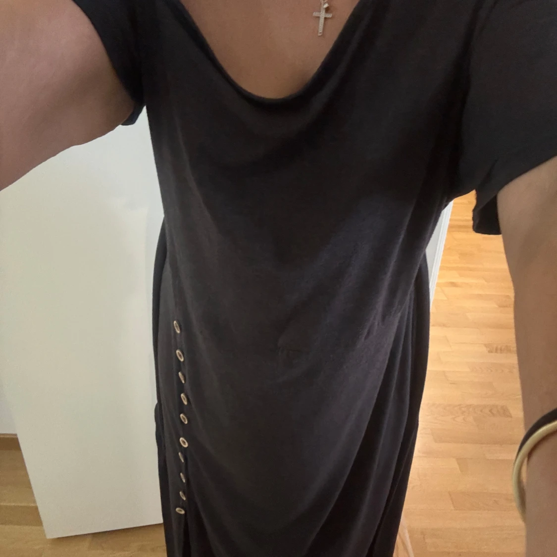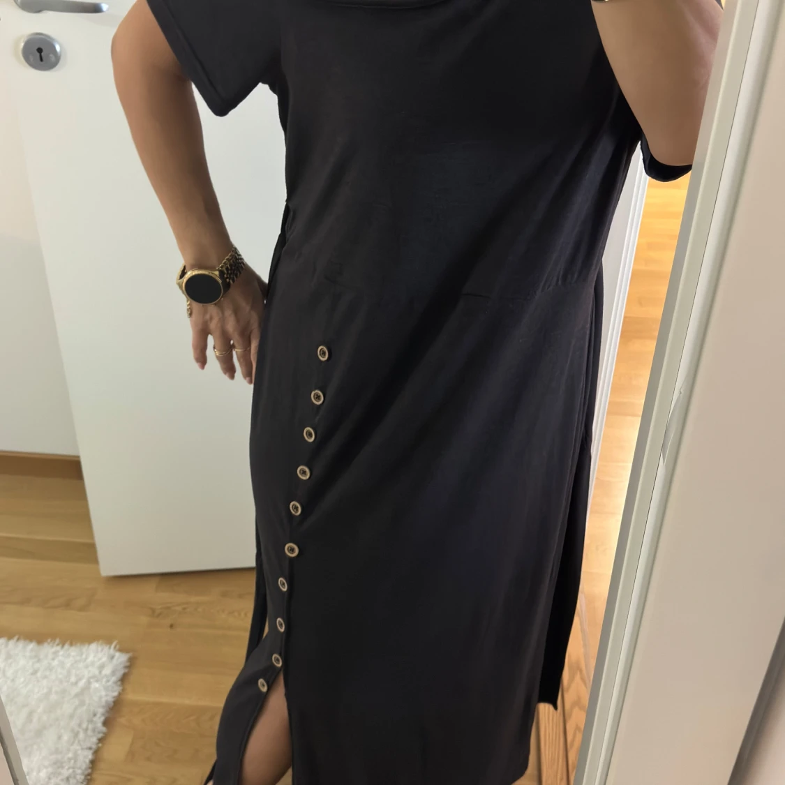 Svart klänning med asymmetrisk offshoulder-design och dekorativa knappar längs ena sidan. Klänningen har en lös passform och är tillverkad i ett mjukt material som faller snyggt. Perfekt för dig som gillar en stilren och modern look.