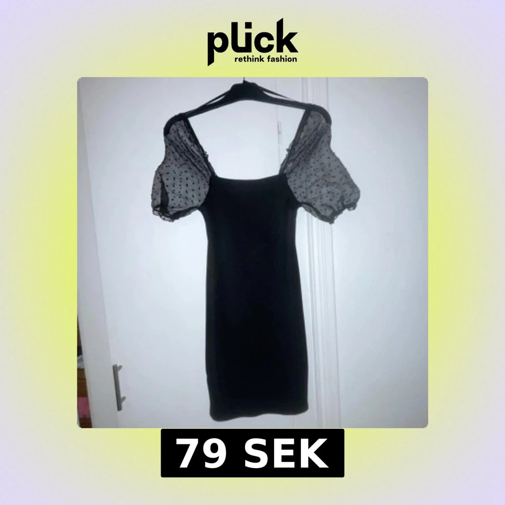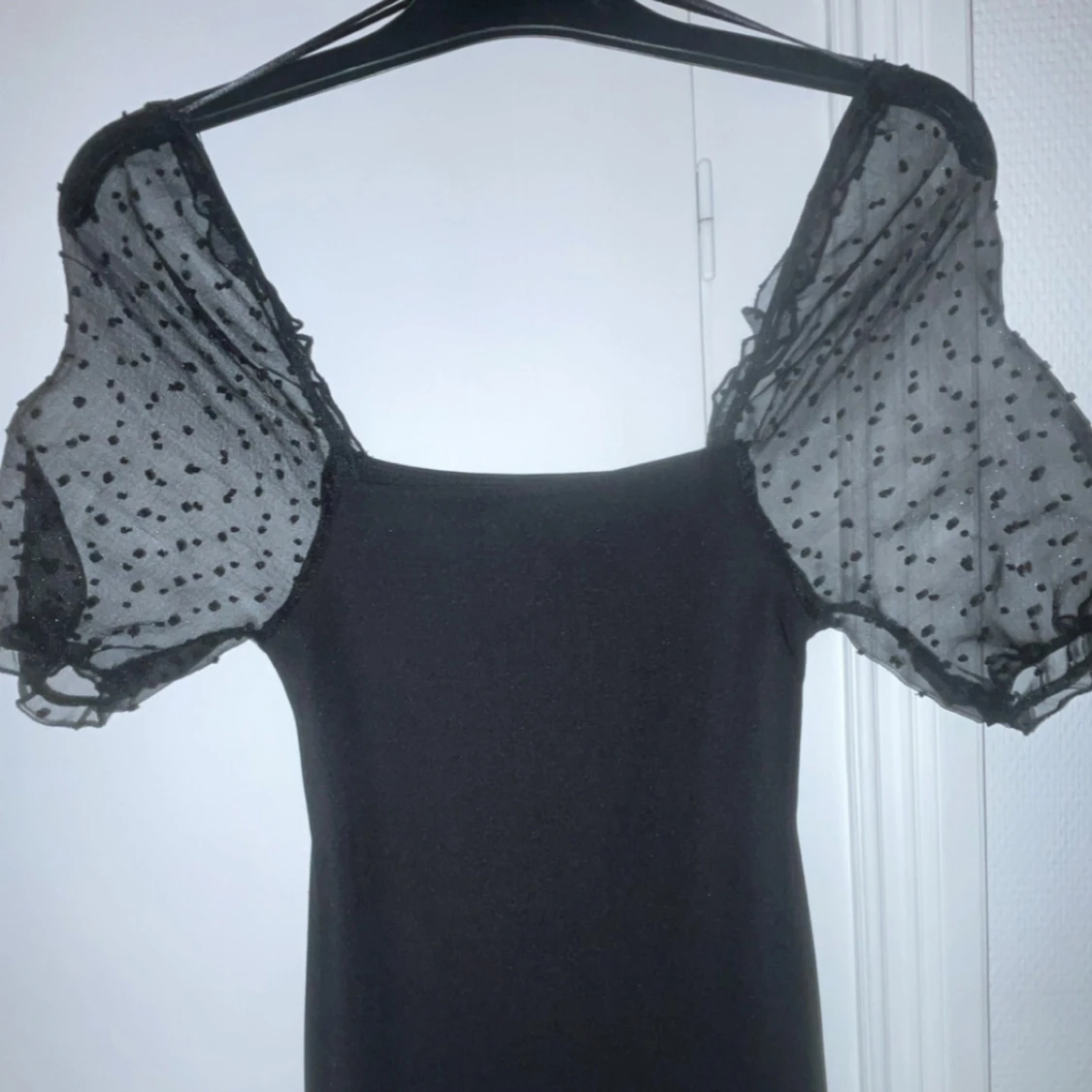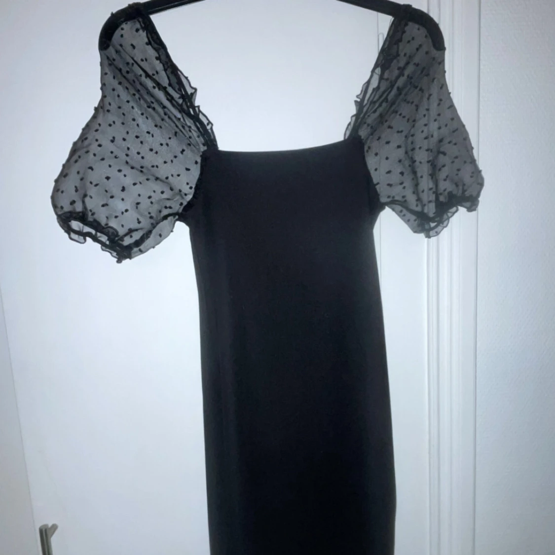 Elegant svart klänning med transparenta puffärmar i prickigt mönster. Perfekt för en stilren look med en touch av lekfullhet.