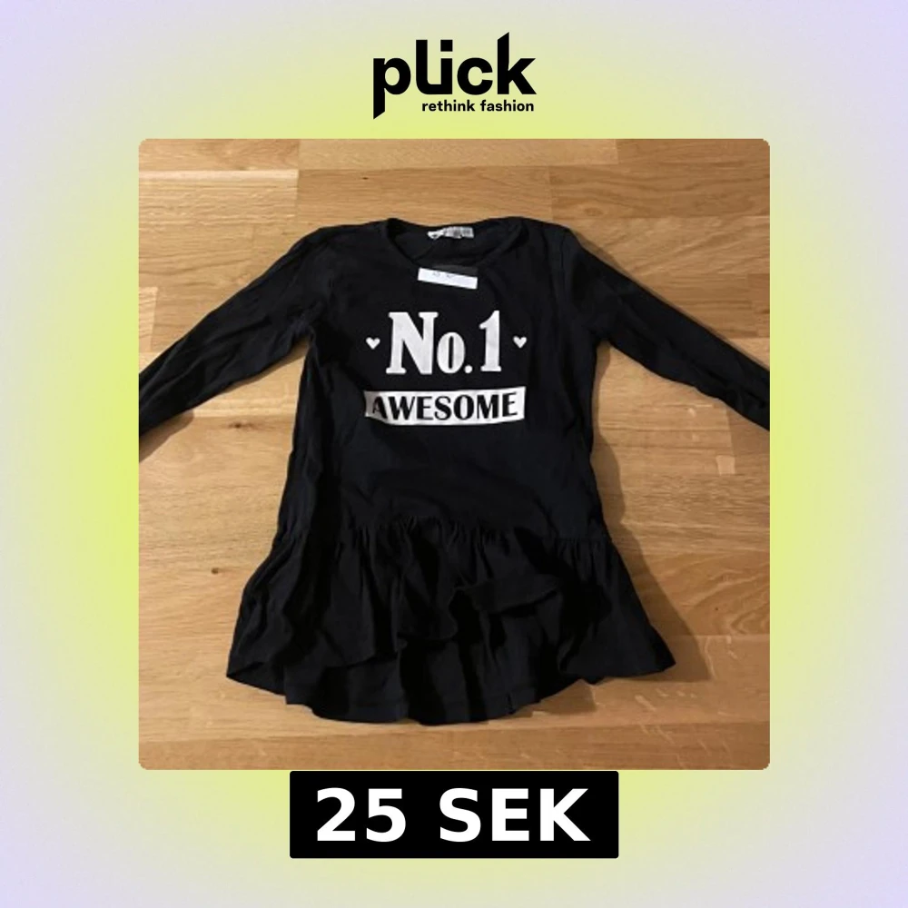 Svart långärmad klänning från KappAhl med vit text 'No.1 AWESOME' och små hjärtan framtill. Klänningen har volang nertill och är i mjuk bomull, perfekt för en cool och avslappnad stil.