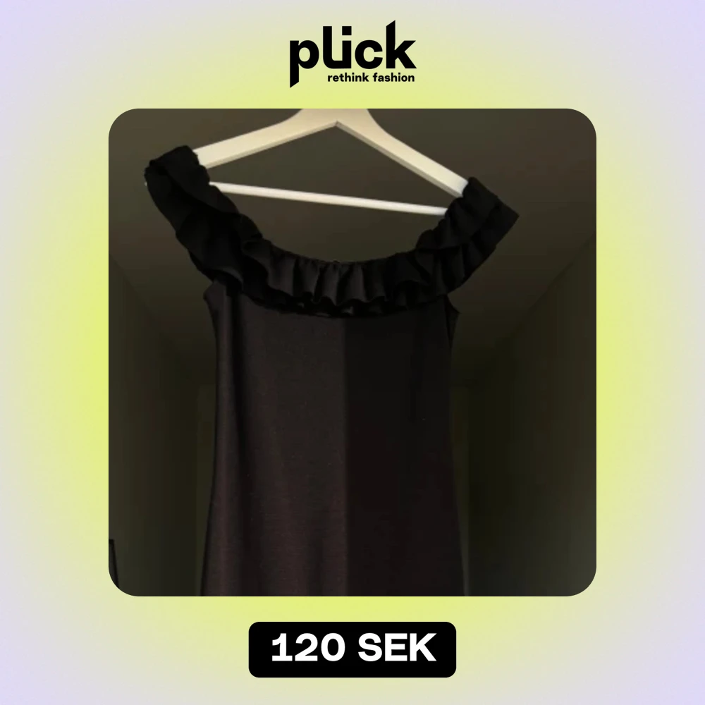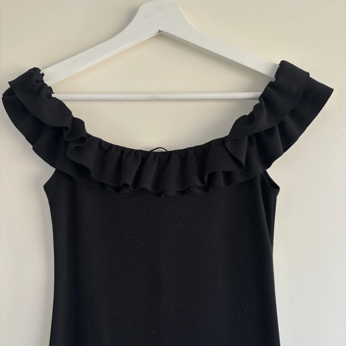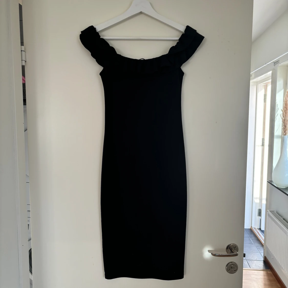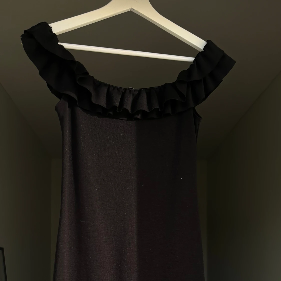 Svart off shoulder klänning med volanger. Klänningen är i midilängd. Använd en gång så jättebra skick.
