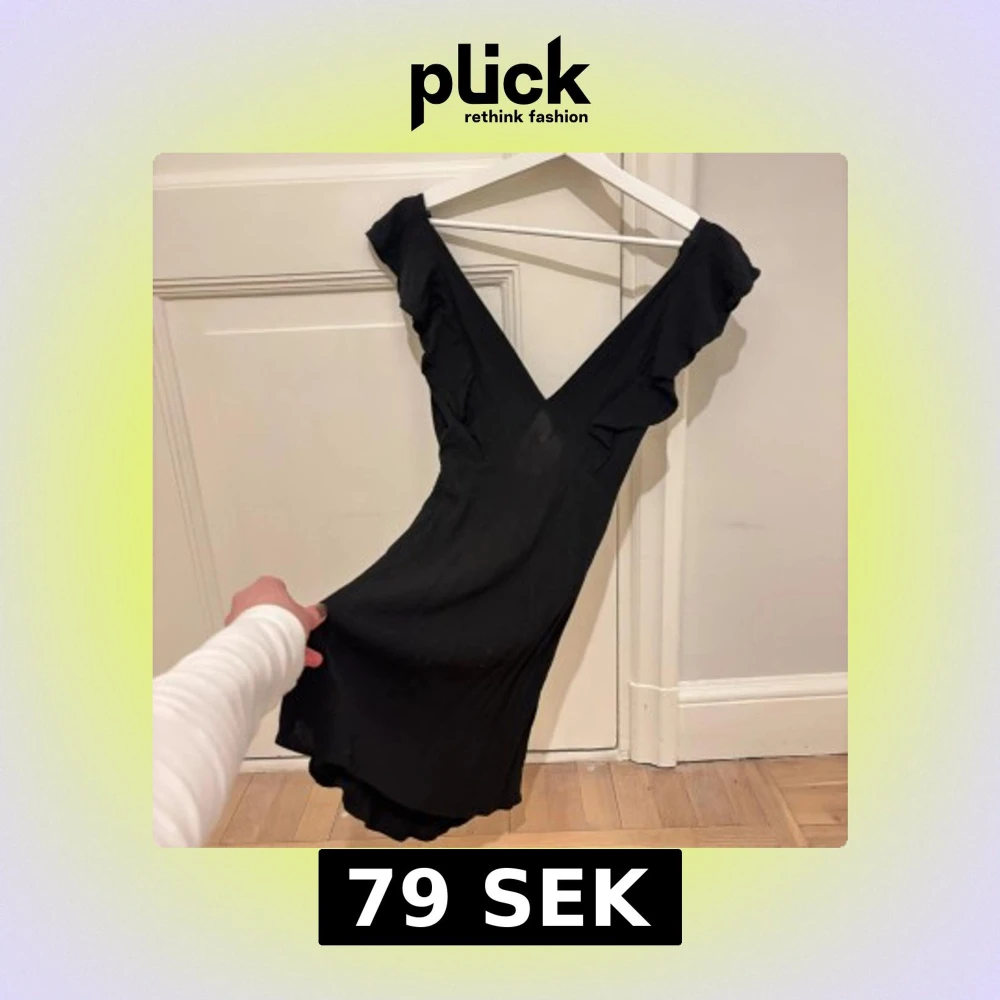 Snygg svart klänning med v-ringad design och volangdetaljer vid axlarna. Perfekt för en elegant look. Klänningen har en öppen rygg. Storlek XS.