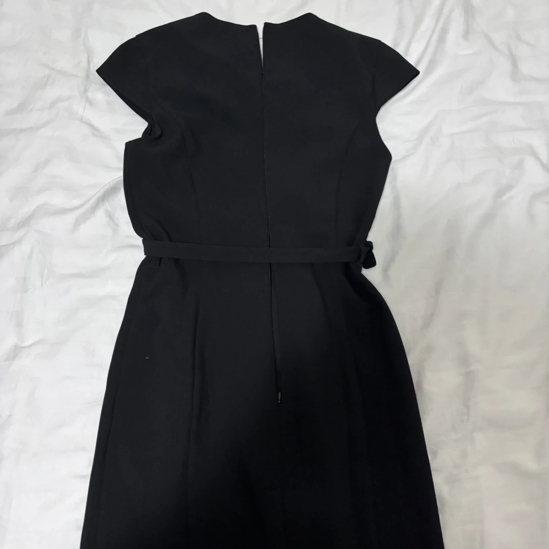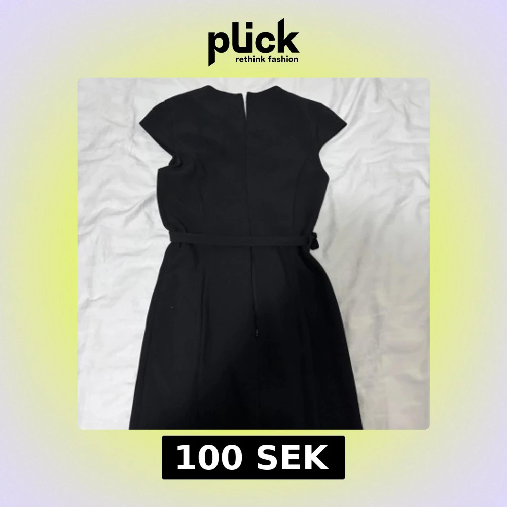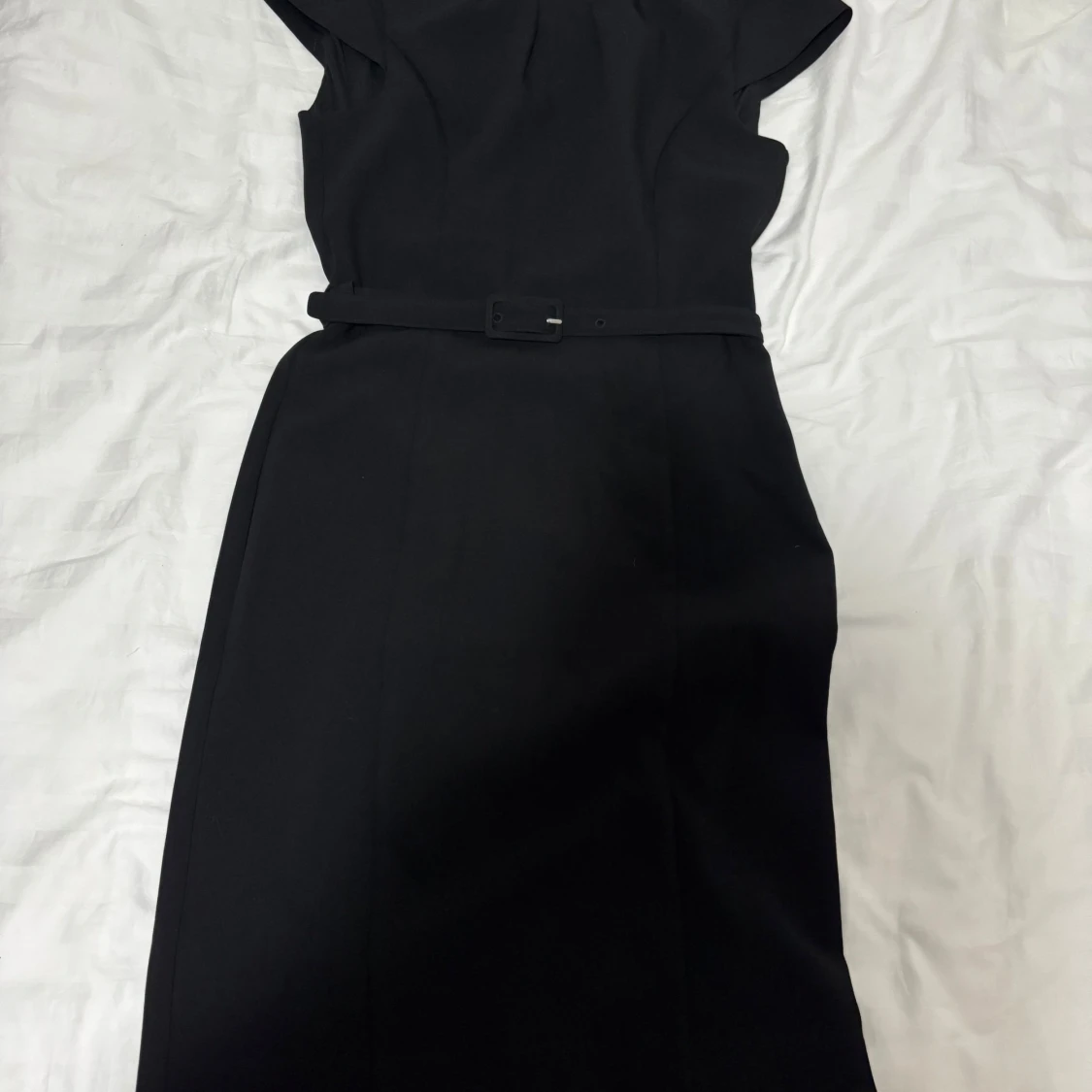 En svart, stilren klänning med bälte i midjan och korta ärmar. Klänningen har en rak, elegant passform och dragkedja bak. Perfekt för dig som gillar en tidlös look med minimalistiska detaljer.
